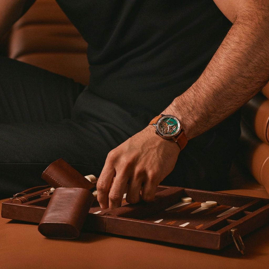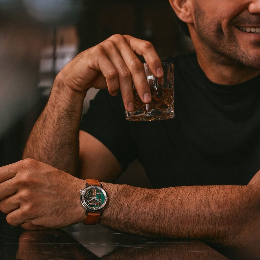 Puzdro z leštenej ocele 904L ponúka jednoduché línie a poteší ergonomicky umiestnenou korunkou na 4. hodine, ktorá poskytuje väčší komfort pri nosení a čistejší profil puzdra. Puzdro dopĺňa prémiový remienok z talianskej teľacej kože v ťavej hnedej farbe, zakončený podpísanou skladacou sponou.