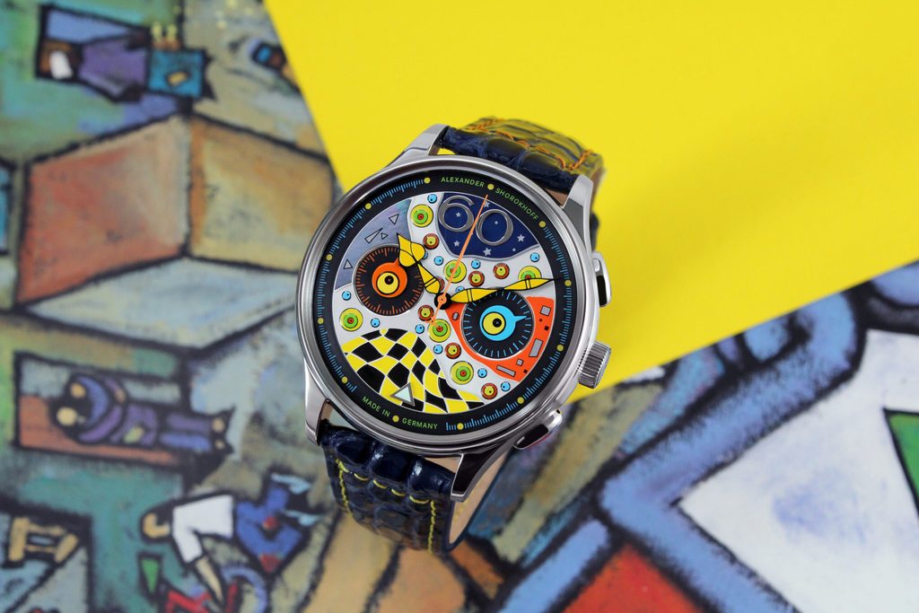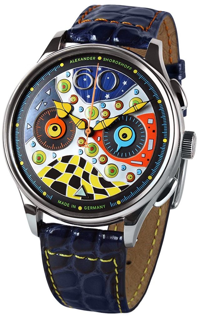 Číslo 60 zostáva tam, kde patrí na všetky hodinky Alexander Shorokhoff, a symbolizuje 60 minút na hodine a revolučnú éru umenia v 60. rokoch 20. storočia. K avantgardnej a výstrednej "tvári" nového chronografu bol vytvorený zodpovedajúci remienok: tmavomodrý remienok z krokodílej kože s oranžovým a žltým prešívaním.