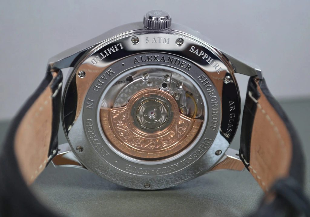 Rotor strojčeka je ručne gravírovaný, ako je vo výrobe Alexander Shorokhoff zvykom, a v tomto prípade pozlátený; na pôsobivý strojček sa oplatí pozrieť cez zafírové sklo zadného krytu. Puzdro je vyrobené z nehrdzavejúcej ocele, luneta a zadná časť puzdra sú vysoko leštené, stredná časť - jemne brúsená. Sklo na prednej strane je antireflexné.
