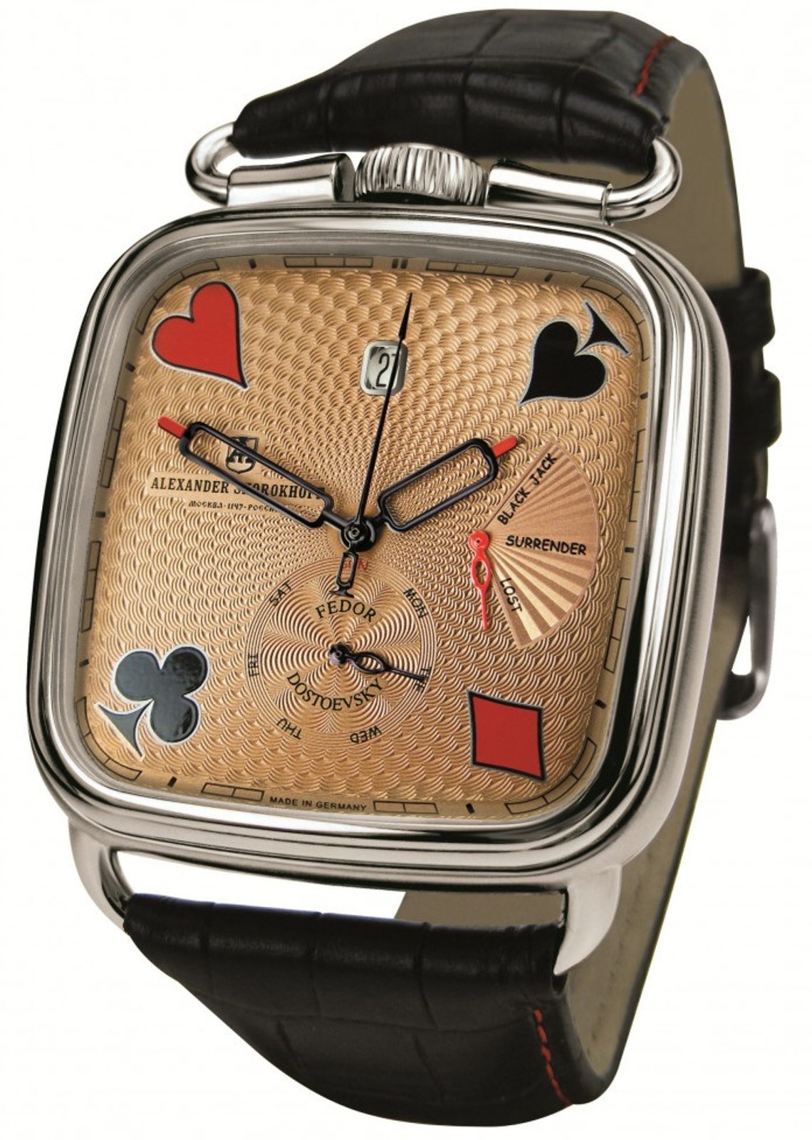 Dostojevskij bol nielen veľký spisovateľ, ale aj vášnivý hráč. S rovnakou vášňou, s akou písal romány, sa vrhol na hazardné hry. V nemeckom Baden-Badene prehral celý svoj majetok. Táto hráčska vášeň tohto spisovateľa motivovala A. Šorochova k vytvoreniu jedinečného dizajnu hodín Fedora Dostojevského.