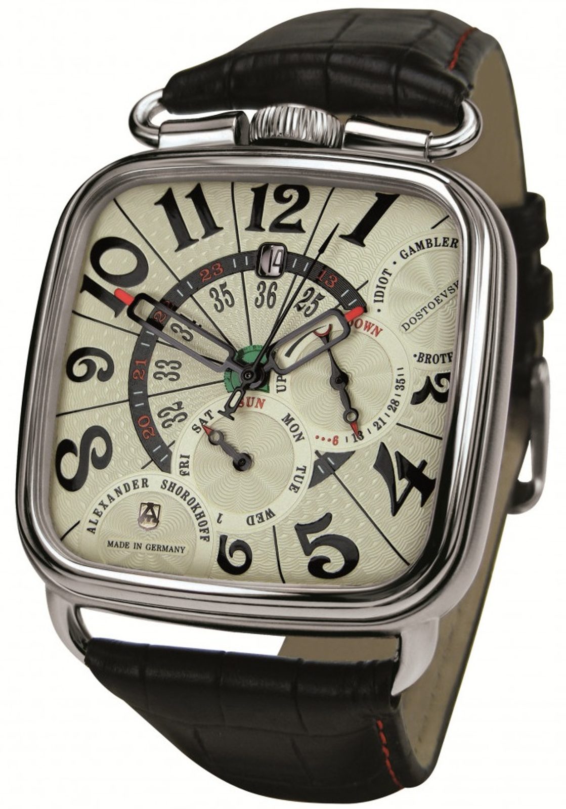 Aby bol model ešte zaujímavejší, Shorokhov umiestnil na ciferník názvy Dostojevského najznámejších diel a jeho logo, ktoré sú v jednej línii tvoriace diagonálu puzdra. Vďaka tomu celý ciferník pôsobí harmonicky vyvážene.