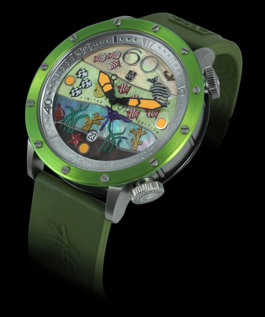 Ciferník zobrazuje pôsobivú kompozíciu rôznofarebných rýb a morských prvkov ako aplikácie s 3D efektom, ktoré vytvárajú živú podmorskú scénu. Tento jedinečný dizajn zachytáva krásu a rozmanitosť podmorského sveta a majstrovsky vyjadruje víziu Alexandra Šorochova.