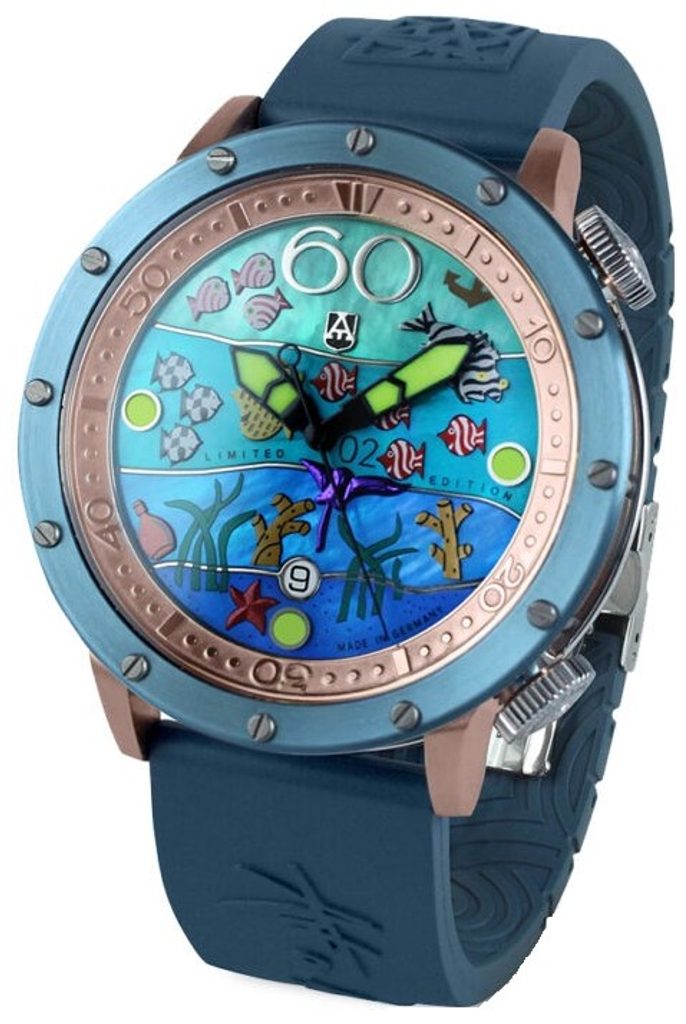 Zadná strana puzdra (dynko) má umelecký dizajn a je na nej nádherný obrázok z morských hlbín - rozkošný pár korytnačiek v 3D prevedení. Vnútri puzdra sa nachádza spoľahlivý a robustný švajčiarsky strojček ETA 2824 alebo ekvivalentný strojček Sellita SW-200 s ručne gravírovaným a rafinovaným rotorom. Na pohodlné nosenie a bezstarostnú manipuláciu bol vyvinutý kvalitný gumový remienok s elegantnou skladacou sponou z masívnej nehrdzavejúcej ocele. Na vrchnej strane remienka je na jednej strane avantgardné logo značky AS a na druhej strane slogan"Umenie na zápästí".