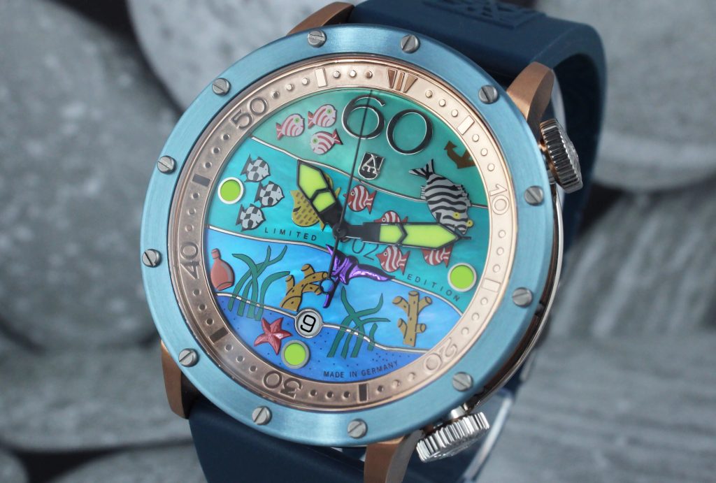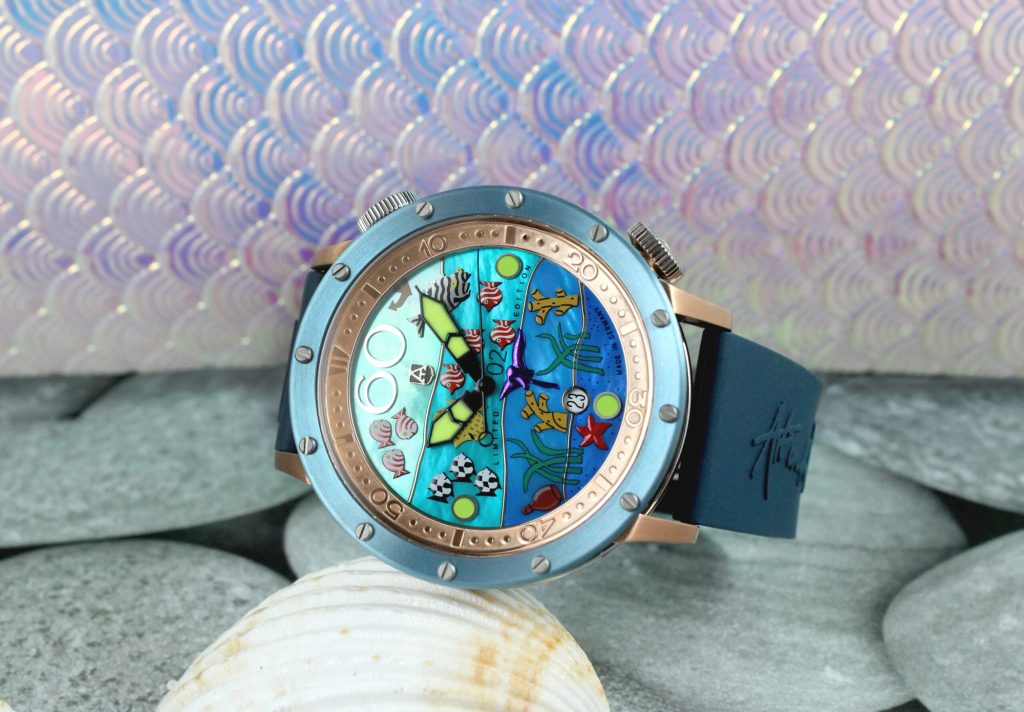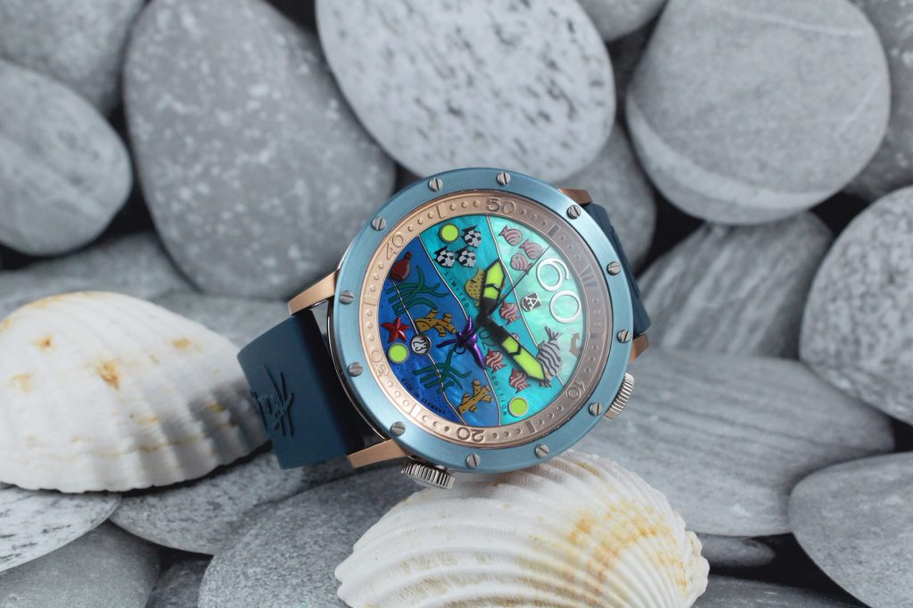 Ciferník zobrazuje pôsobivú kompozíciu rôznofarebných rýb a morských prvkov ako aplikácie s 3D efektom, ktoré vytvárajú živú podmorskú scénu. Tento jedinečný dizajn zachytáva krásu a rozmanitosť podmorského sveta a majstrovsky vyjadruje víziu Alexandra Šorochova.