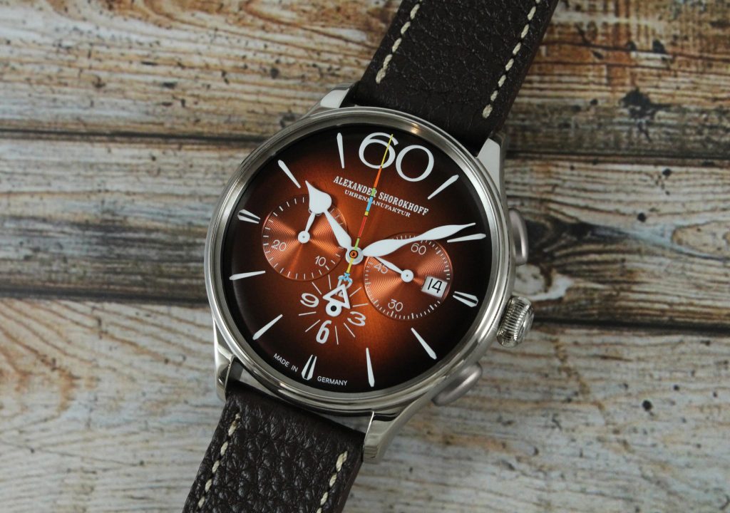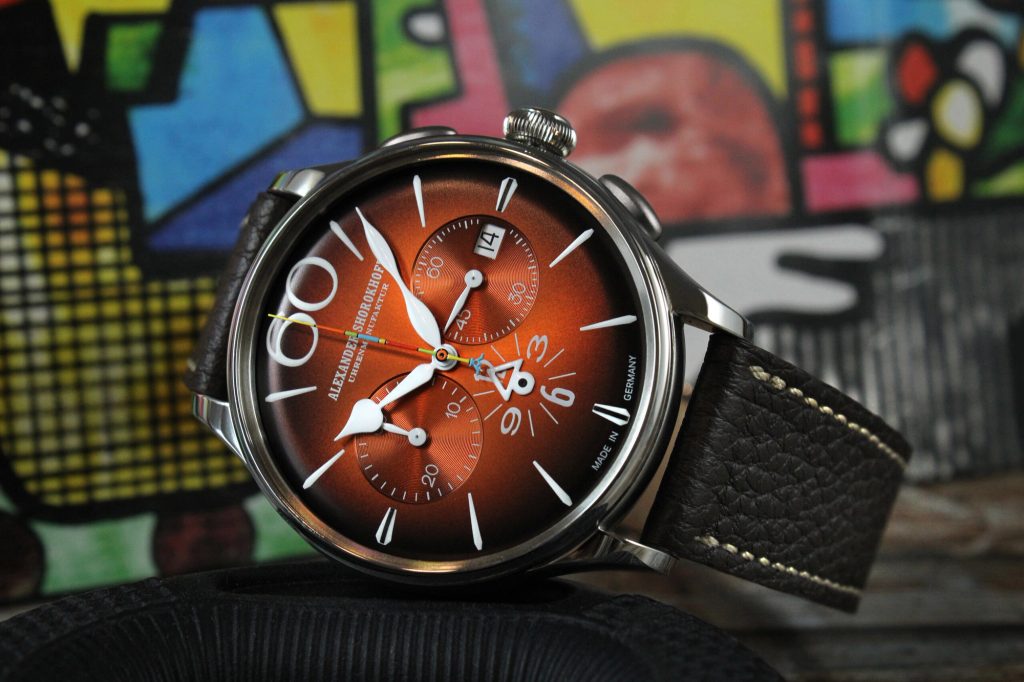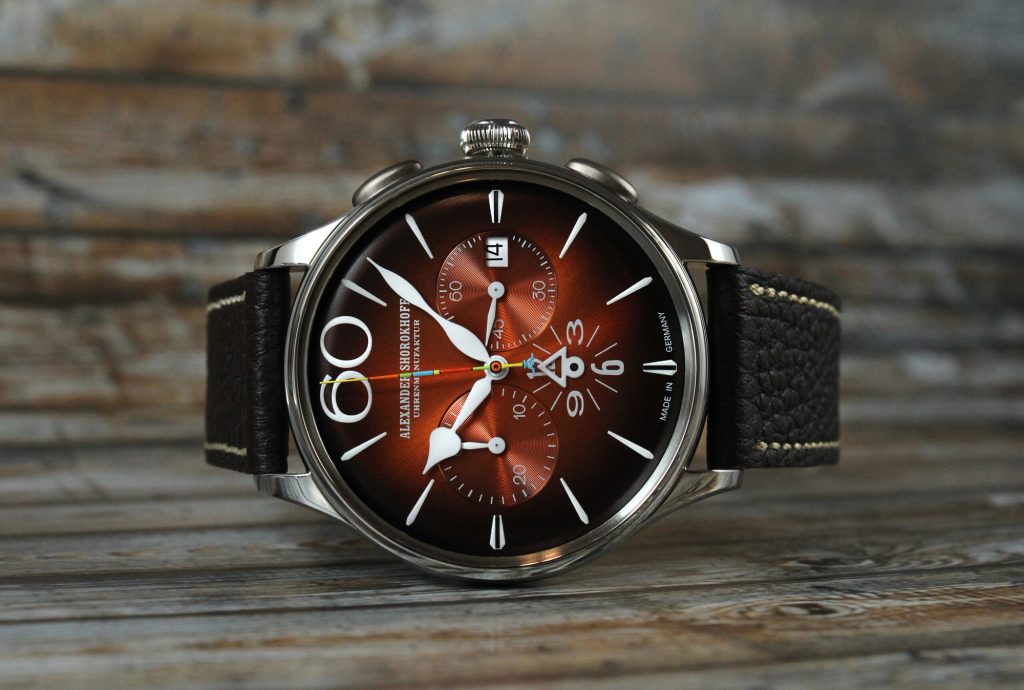 Značka Alexander Shorokhoff prináša ďalší farebný variant modelu Happy Second. Po odvážnom prvom modeli prichádza nástupca v úplne novom farebnom prevedení. Nový chronograf Happy Second Orange žiari ciferníkom v teplej retro oranžovej farbe, ktorá po stranách prechádza do tmavohnedej - nezvyčajná farebná kombinácia pre Alexandra Shorokhoffa, ktorý zvyčajne poteší svojimi odvážnymi, farebnými výtvormi.
