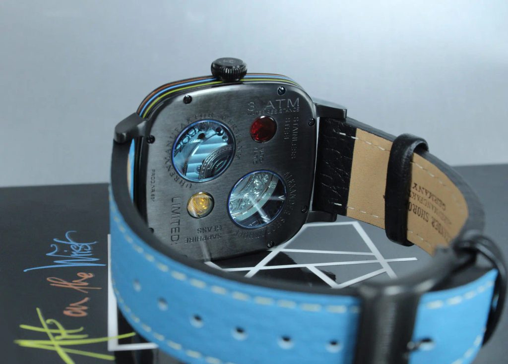 Obdĺžnikové puzdro z ušľachtilej ocele s povrchovou úpravou čiernym PVD a s bočnými výrezmi s oranžovým, modrým a žltým smaltom stelesňuje modernosť a dopĺňa kreatívny dizajn ciferníka. Rovnako nezvyčajný je aj ciferník, ktorý má štyri malé okrúhle sklenené okienka vyhotovené v troch rôznych avantgardných farbách - červenej, žltej a modrej. S rozmermi 41 x 41 milimetrov sa hodinky ľahko zmestia na takmer každé zápästie.
