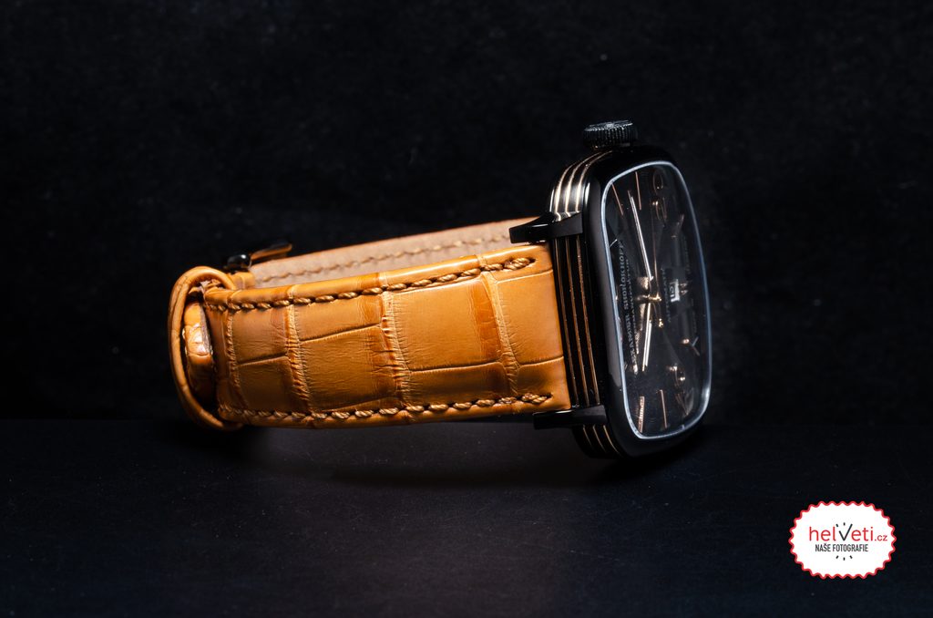 Gravírovaný ciferník v tvare štvorcov je typický pre kubizmus, jeden z avantgardných umeleckých smerov. Štvorcové puzdro je na boku osadené drôtikmi z 18-karátového zlata, ktoré tvoria nenápadnú a elegantnú ozdobu hodiniek, čím zvyšujú ich hodnotu. Na ciferníku nájdeme štyri okrúhle priehľadné otvory, ktoré odhaľujú krásu ručne gravírovaného strojčeka.