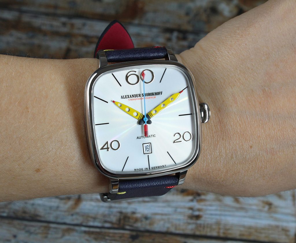 Podlhovasté ručičky s okrúhlymi priehlbinami sú vyvedené v troch žiarivých avantgardných farbách - červenej, modrej a žltej - a sú dokonale zladené navzájom a s hrou kontrastov. Zaoblené priehlbiny dodávajú ručičkám elegantnú ľahkosť, ktorá dokonale ladí s ich štíhlym dizajnom. Na ciferníku samozrejme nesmú chýbať charakteristické veľké číslice 20, 40 a 60.