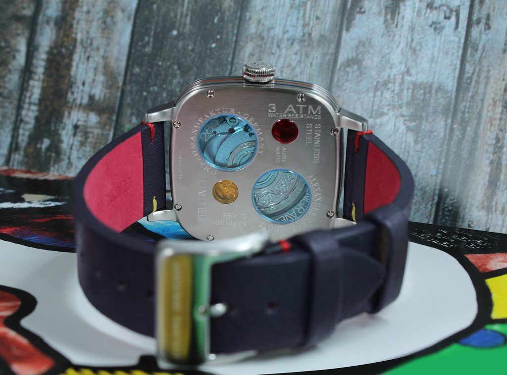 Hodinky poháňa vysokokvalitný švajčiarsky automatický strojček s ručne gravírovaným a rafinovaným oscilačným závažím, modrými skrutkami a 21 drahokamami. Rezerva chodu je približne 47 hodín. Kožený remienok bol navrhnutý v rovnakom štýle ako ciferník, s farebným kontrastným prešívaním v červenej a žltej farbe na tmavomodrej - kontrastné, ale vyvážené.