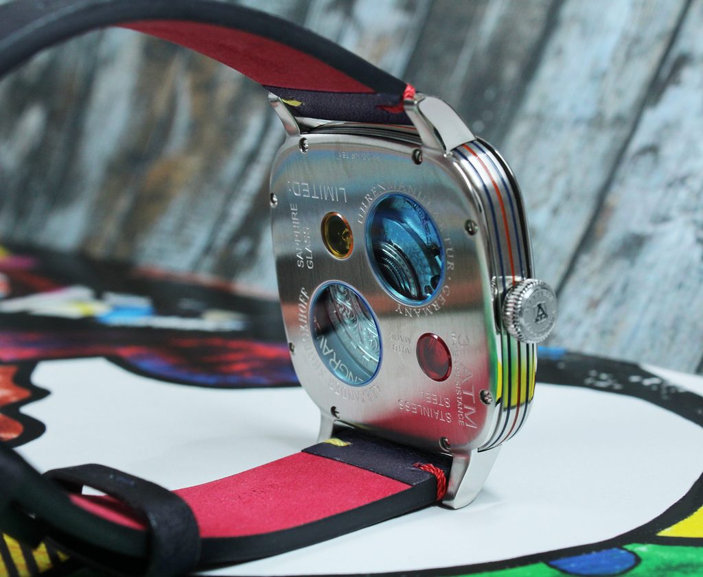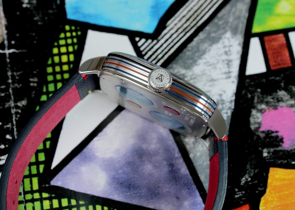 Obdĺžnikové puzdro z ušľachtilej ocele s farebným smaltom po stranách stelesňuje modernosť a zároveň vyžaruje eleganciu a sofistikovanosť. Ide o skutočne neobvyklý dizajn, pretože puzdro nemá obvyklé uchá na pripevnenie remienka - tie sú k puzdru privarené neskôr. Rovnako nezvyčajná je aj zadná strana puzdra, ktorá integruje štyri malé okrúhle sklíčka v troch rôznych avantgardných farbách - červenej, žltej a modrej."Umenie na zápästí" je slogan manufaktúry a model Kandy Crazy Hands Special je toho nepochybne úspešným príkladom.