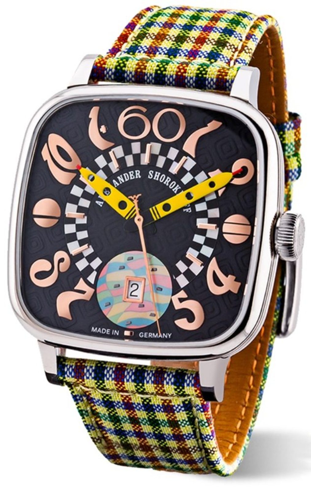 Každý prvok rozpráva svoj vlastný príbeh: geometricky tvarovaný ciferník, čiernobiely vzor v strede doplnený aplikáciou z pravej perlete, farebná perleťová vložka na pozícii 6 hodín, ktorá elegantne zobrazuje dátum. Podlhovasté ručičky s kruhovými výrezmi v čiernej, žltej a červenej farbe okamžite upútajú pozornosť. Dokonca aj mierne odcentrované hodinové číslice dávajú jasne najavo, že fantázii sa tu medze nekladú - presne tak, ako to vnímal sám Alexander Shorokhoff.