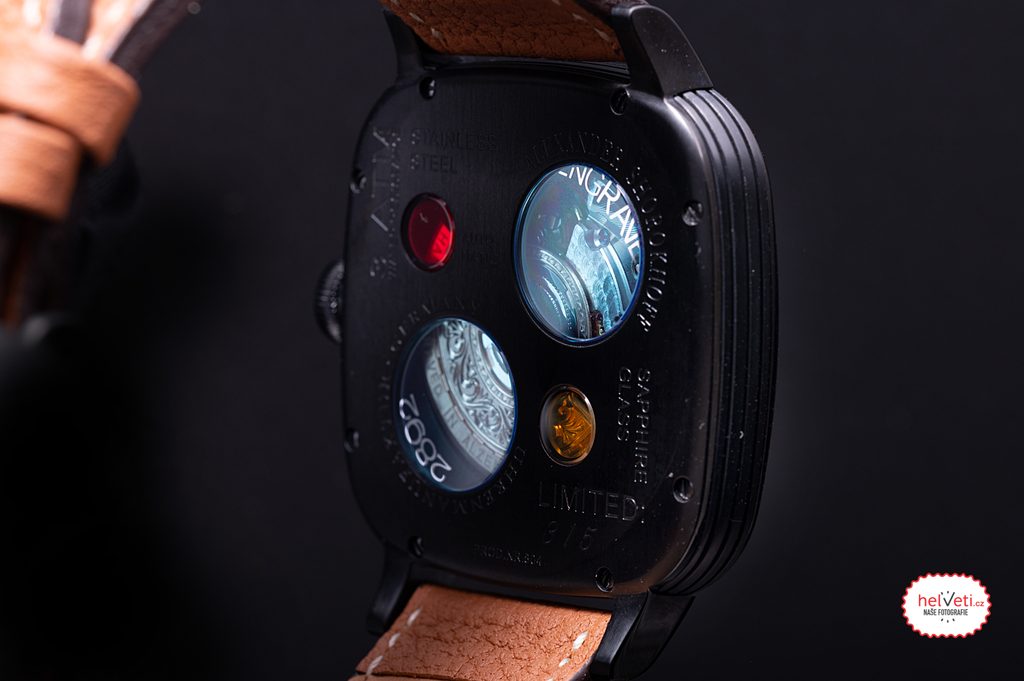 Obdĺžnikové puzdro z ušľachtilej ocele s povrchovou úpravou čiernym PVD predstavuje modernosť a individualitu. Tri malé výrezy po stranách dodávajú hodinkám šmrnc. Unikátna je aj zadná strana puzdra so štyrmi malými okrúhlymi okienkami v troch rôznych farbách typických pre štýl Avant Garde - červenej, žltej a modrej.