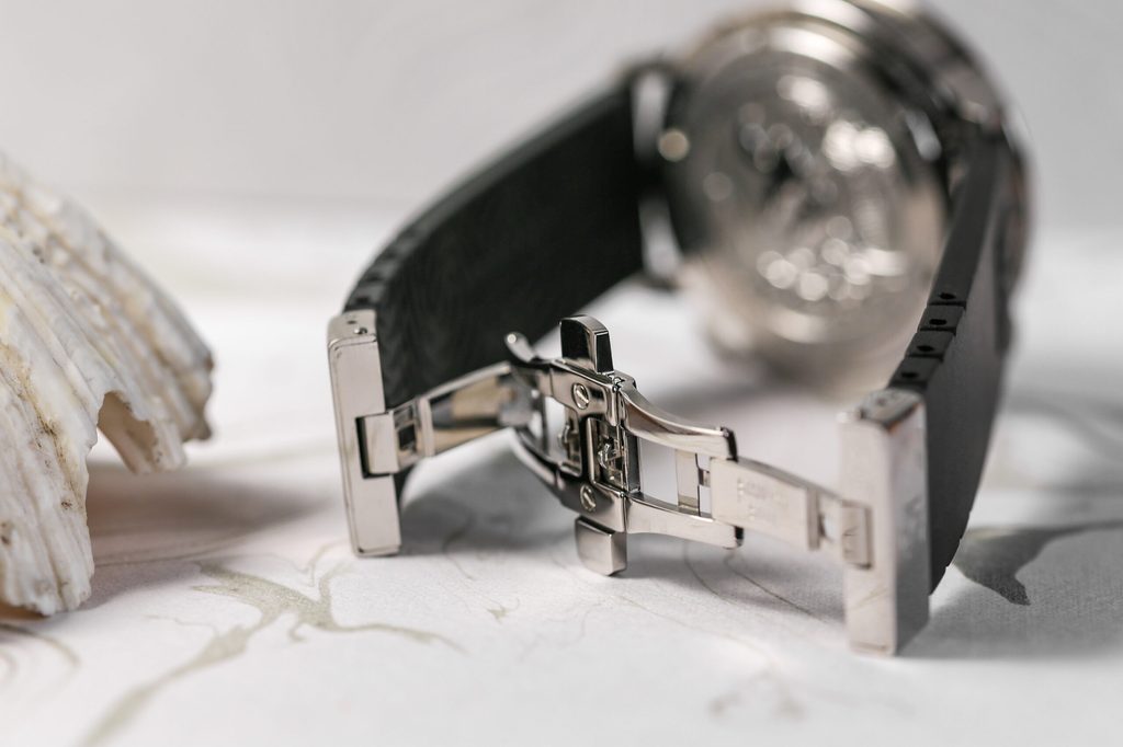 Špeciálne vyvinuté, mimoriadne robustné puzdro sa skladá zo šiestich častí: hornej lunety so zafírovým sklíčkom, vnútornej otočnej lunety, strednej časti a dvoch krytov. Všetko drží pohromade 12 tyčí z nehrdzavejúcej ocele a 12 skrutiek. Dve korunky - na 2. hodine pre vnútornú lunetu a na 4. hodine pre nastavenie času - sú zreteľne označené a dvojito utesnené pre vysokú ochranu pred vodou. Zadnú stranu puzdra zdobí umelecký 3D motív z morských hlbín: dvojica korytnačiek. Pod ním pracuje spoľahlivý automatický kaliber Selita SW-200 švajčiarskej výroby s ručne gravírovaným, rafinovaným rotorom.