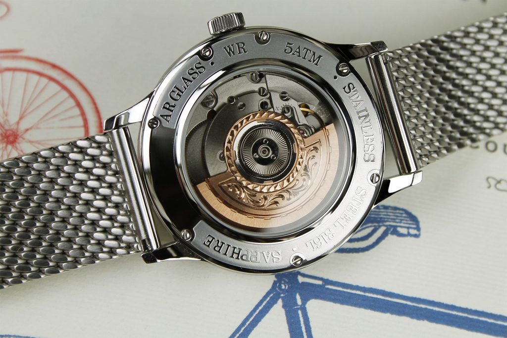 Puzdro hodiniek Sixtythree AS.LA02-5M je vyrobené z ušľachtilej ocele. Vo vnútri sa nachádza mechanický strojček s automatickým naťahovaním 2892.AS. Strojček je ručne opracovaný, gravírovaný a vďaka priehľadnému zafírovému sklíčku krásne viditeľný. Je osadený 21 drahokamami a má rezervu chodu 47 hodín. Na pozícii 6 sa nachádza praktická dátumovka. Všetko chráni zafírové sklíčko s antireflexnou úpravou.