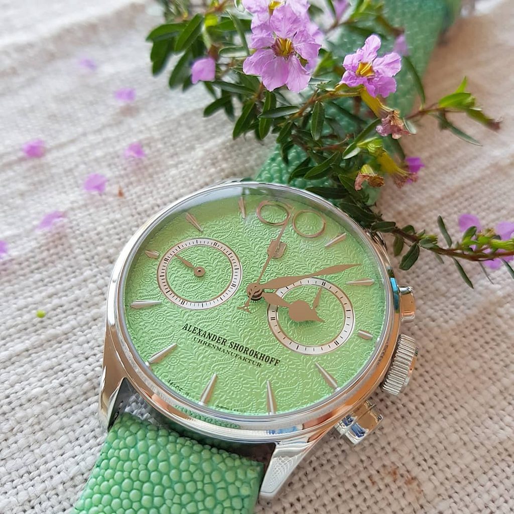 ModelAlexander Shorokhoff Spring AS.LCD-SPR je nielen farebný, ale aj dekoratívny. Preto bol vyvinutý špeciálny vzor ciferníka v paisley (kašmírovom) vzhľade, ktorý plne zodpovedá prvým pocitom jari. Puzdro, ručičky a ďalšie detaily sú ponechané v chladných strieborných tónoch. Na zdôraznenie živosti jari sa Alexander Shorokhov rozhodol vyrobiť hodinky ako chronograf. Vďaka tomu vyžarujú viac energie a zároveň majú viac funkcií.