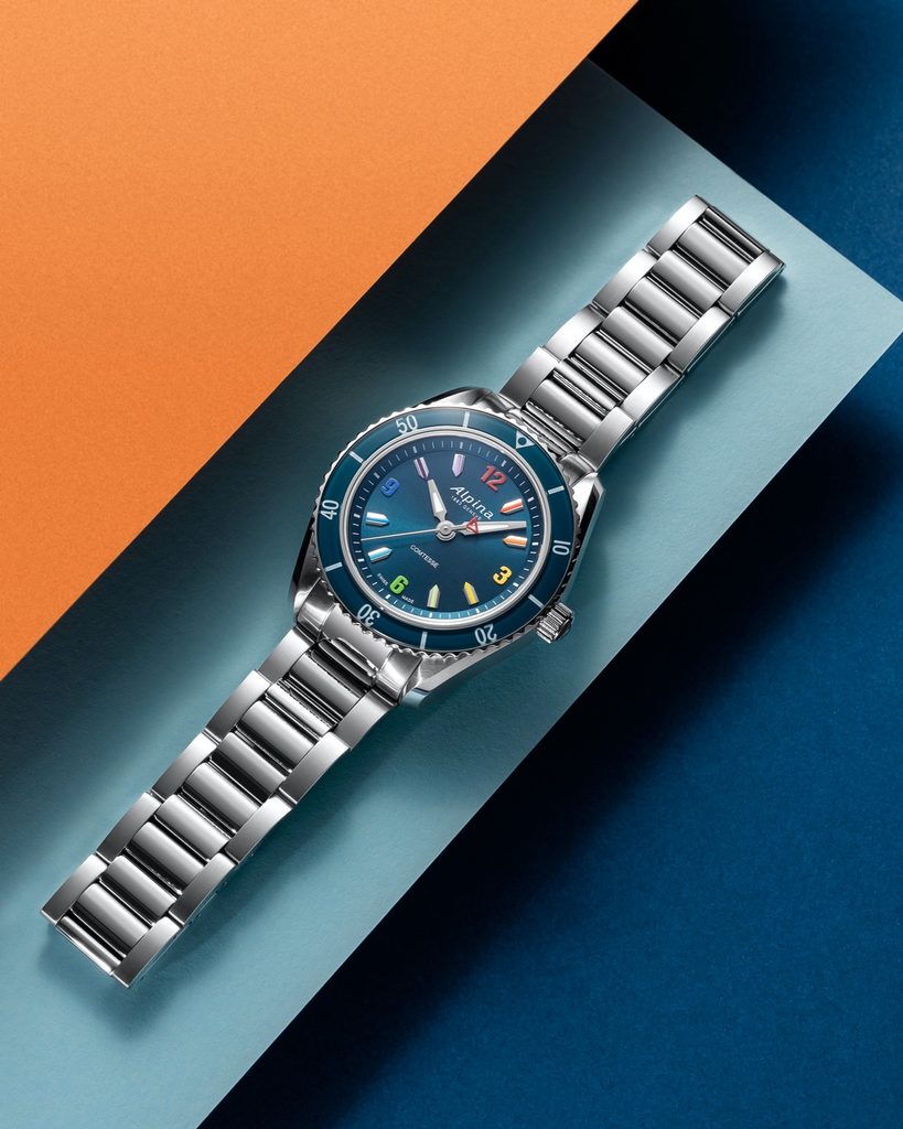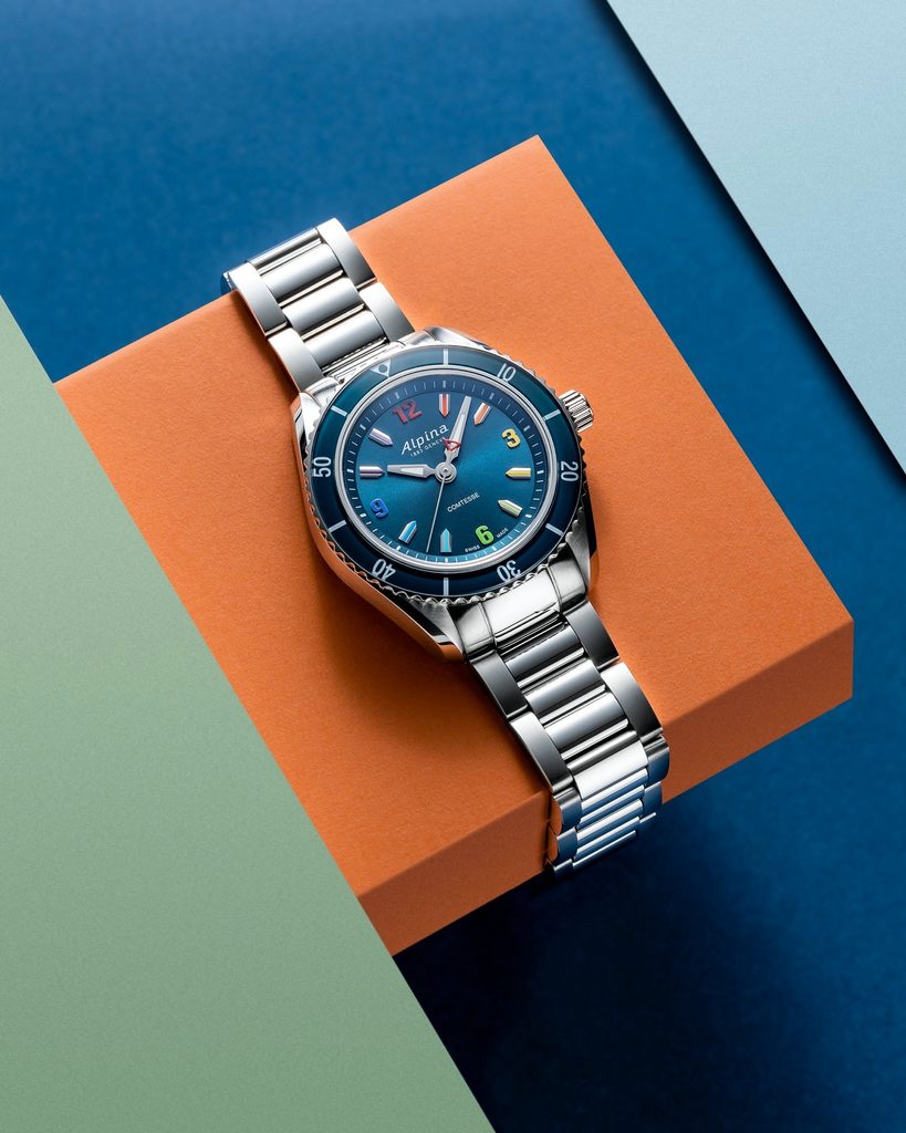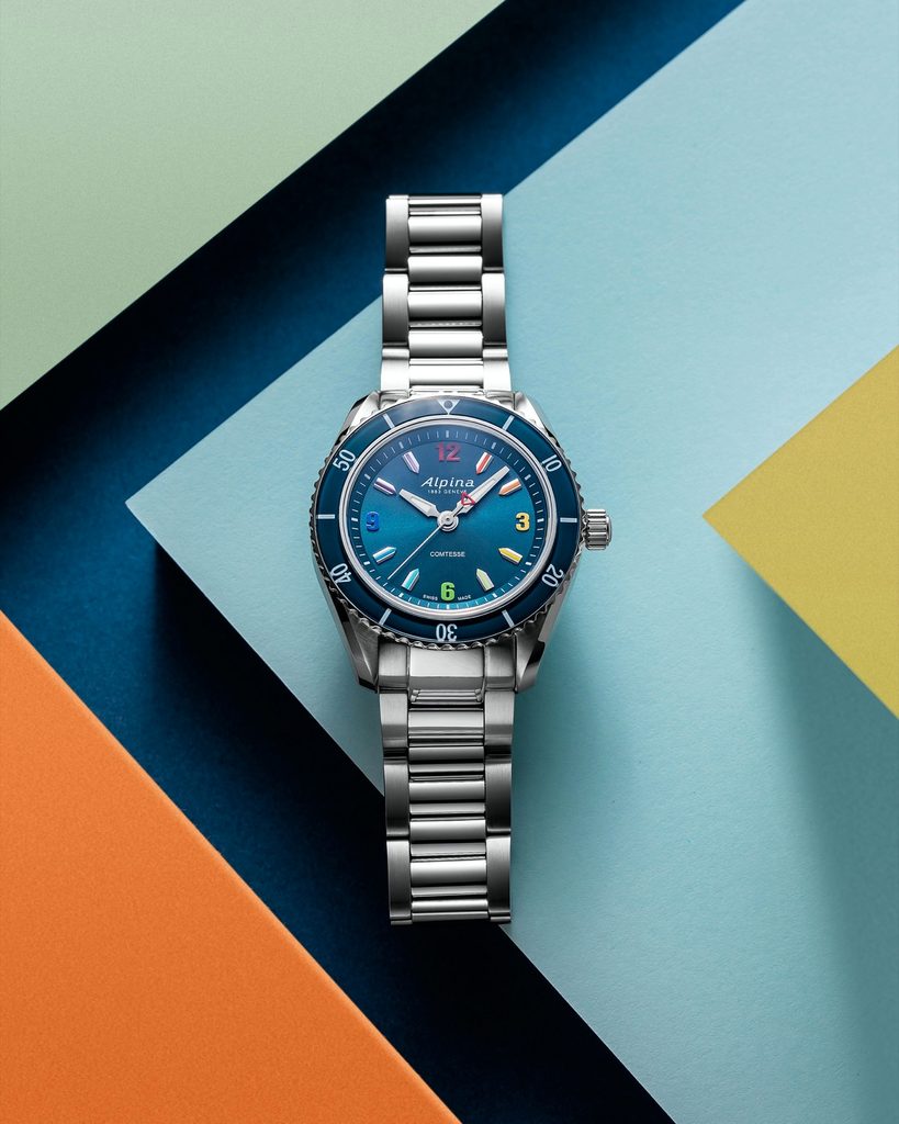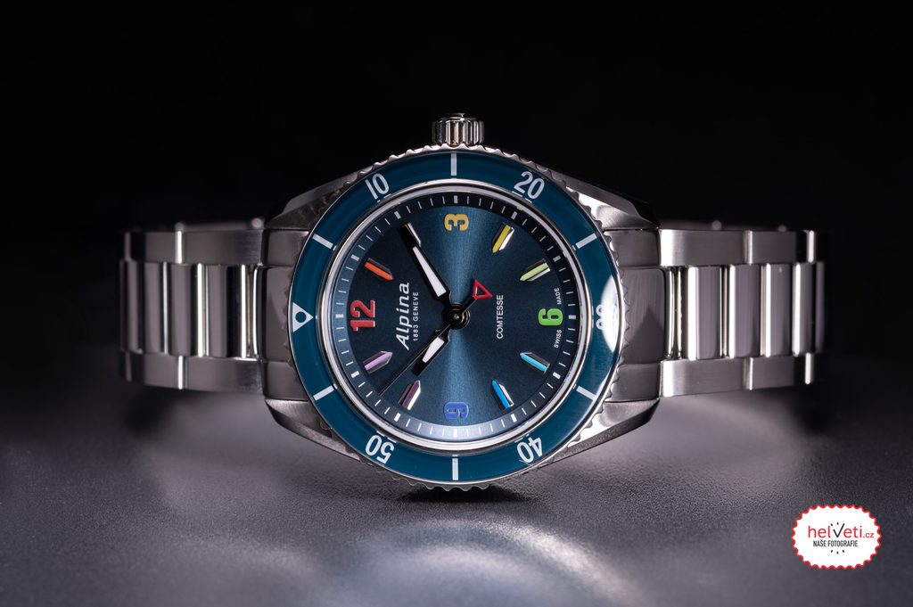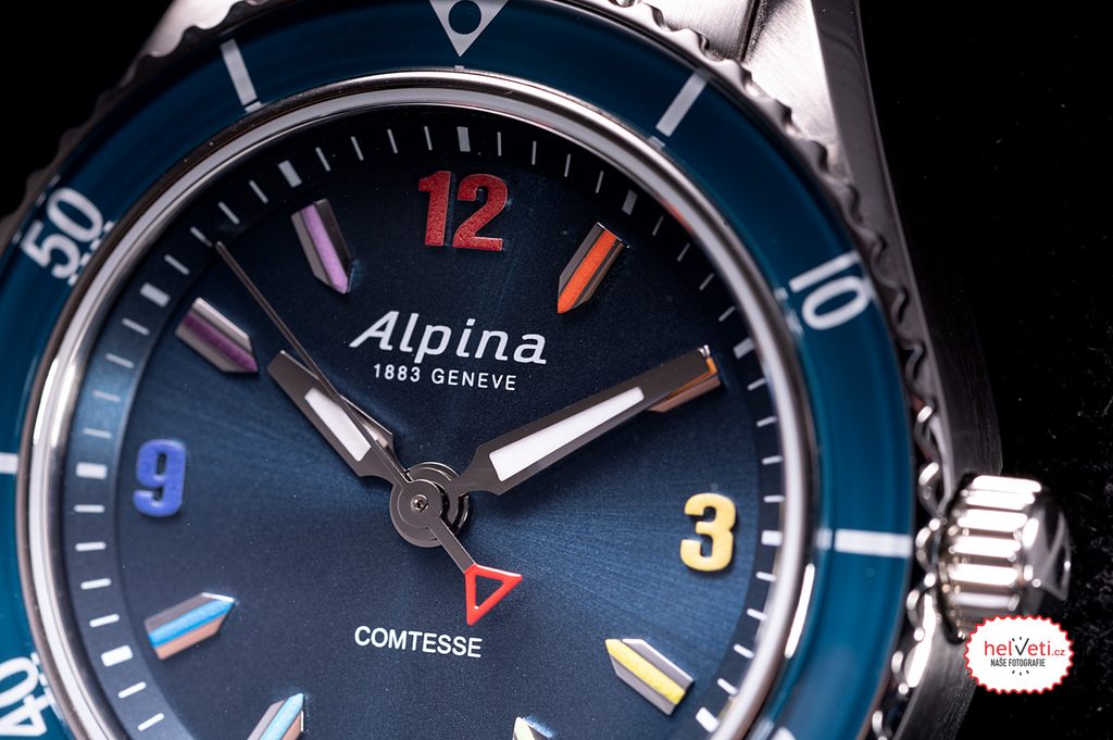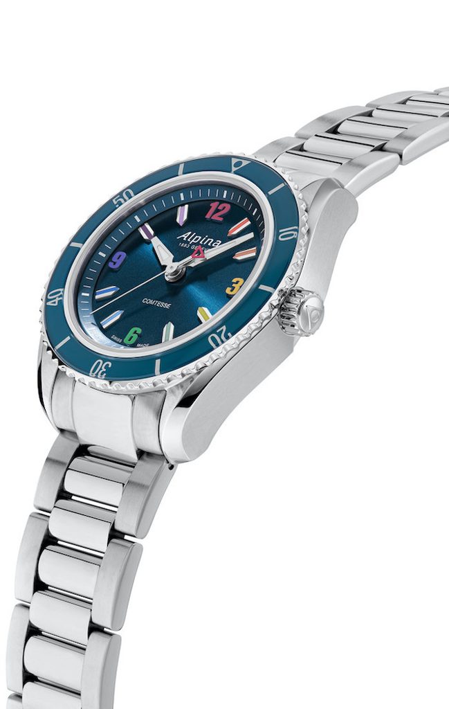 Hodinky Alpina Comtesse Sport Quartz Rainbow Limited Edition AL-235NRB3C6B sú súčasťou línie Comtesse a vďaka svojmu elegantnému vzhľadu sú vhodné na spoločenské príležitosti, ale sú ideálne aj na každodenné nosenie. Tento model s nezvyčajnými dúhovými indexmi bol vyrobený len v 288 kusoch pre celý svet.