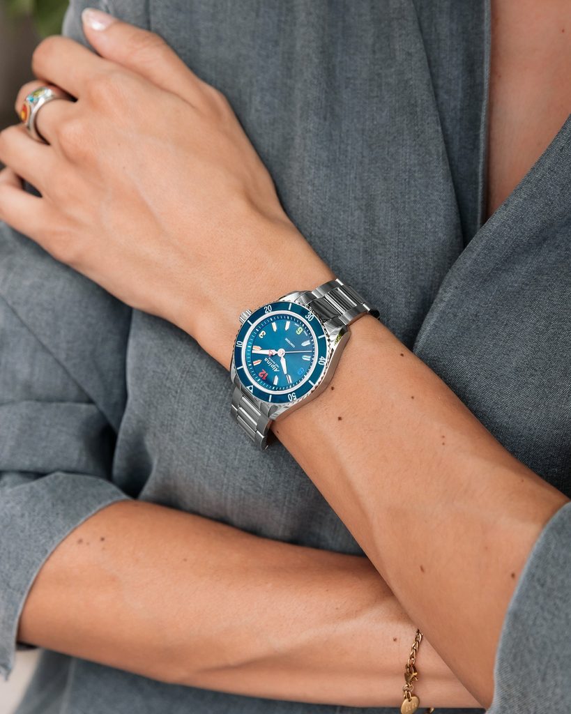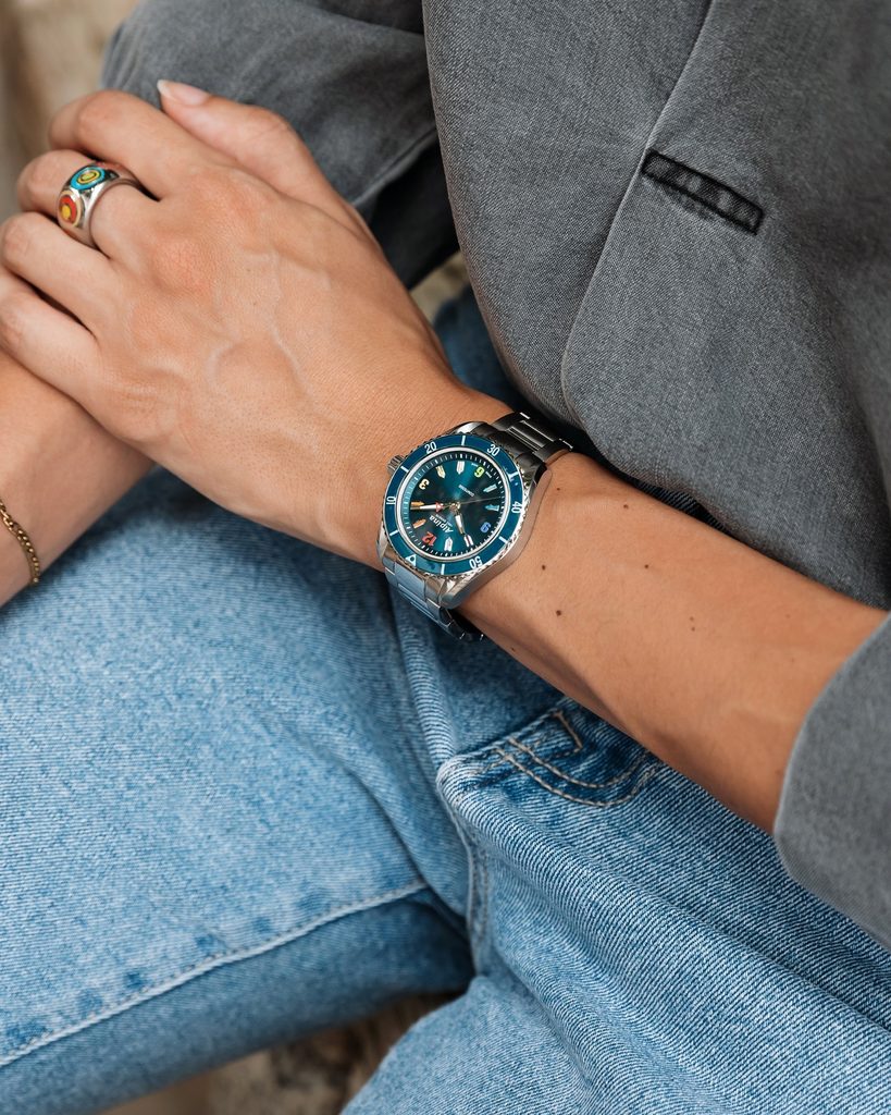 V oceľovom puzdre sa nachádza švajčiarsky strojček AL-240 na batériový pohon (vychádza z modelu Ronda 515), ktorý má na pozícii šiestich hodín funkciu zobrazenia dátumu. Dokonale prehľadný a zároveň elegantný ciferník s viacfarebnými indexmi chráni zafírové sklíčko, ktoré je vysoko odolné proti poškriabaniu. Na meranie času slúži jednosmerne rotujúca luneta.
