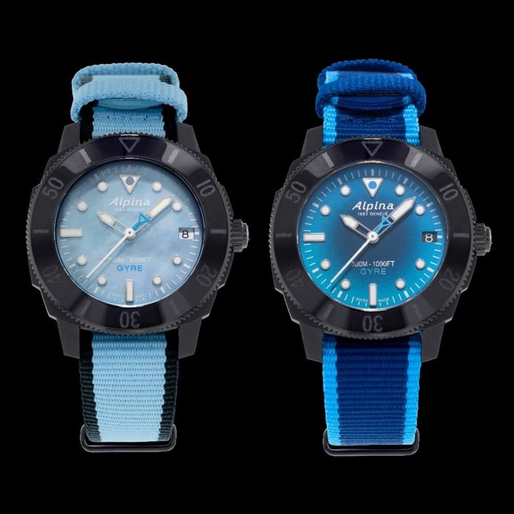 Kolekcia Alpina Gyre bola vytvorená na podporu čistoty oceánov, keďže značka Alpina bola vždy spájaná s prírodou a jej šetrným skúmaním. V spolupráci s organizáciou Surfrider Foundation Europe, ktorá bojuje proti znečisťovaniu oceánov, bola táto jedinečná edícia vytvorená z materiálov vylovených z oceánu ako plastový odpad. Puzdrá týchto hodiniek sú vyrobené z rybárskych sietí vylovených z Indického oceánu. Remienky, ktorých farba odkazuje na farby oceánu, sú potom vyrobené z plastových fliaš alebo vegánskej kože z jabĺk. Dokonca aj špeciálna krabička je vyrobená z recyklovaného plastu. Nákup týchto materiálov zabezpečuje spoločnosť Gyre Watch. Názov Gyre bol zvolený s cieľom upozorniť na skutočnosť, že väčšina plastov sa dostáva do oceánov, kde ich pohlcujú a ďalej rozptyľujú oceánske "gyre" - teda búrky alebo prúdy.
