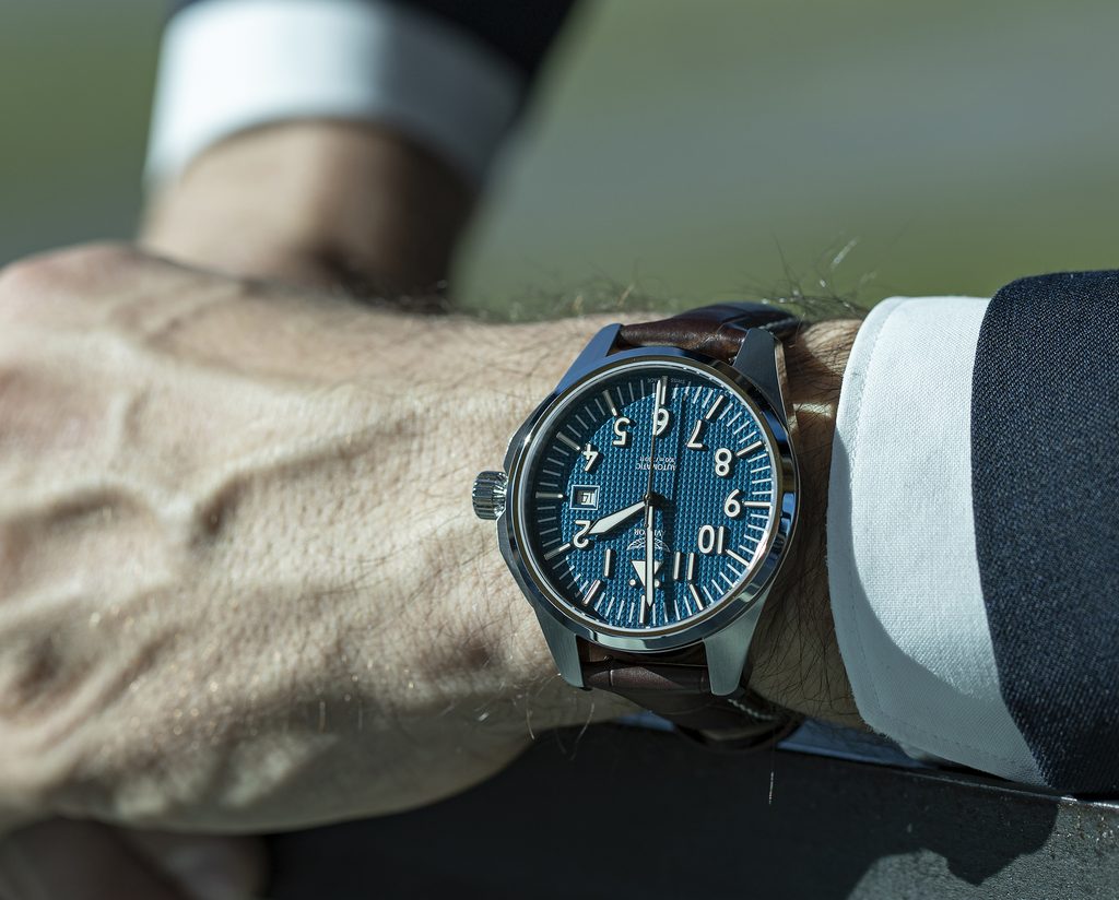 Ciferník, ktorý evokuje ducha pilotnej kabíny, je navrhnutý s matnou zrnitou textúrou, ktorá dodáva hodinkám viac prístrojového dojmu. Jeho minimalistické, vysokokontrastné ručičky a číslice zaručujú vynikajúcu prehľadnosť a čitateľnosť, zatiaľ čo okienko kalendára na pozícii troch hodín umocňuje jeho jedinečný dizajn. Každý detail bol premyslený tak, aby sa v ňom snúbila autentickosť so vzhľadom inšpirovaným letectvom.