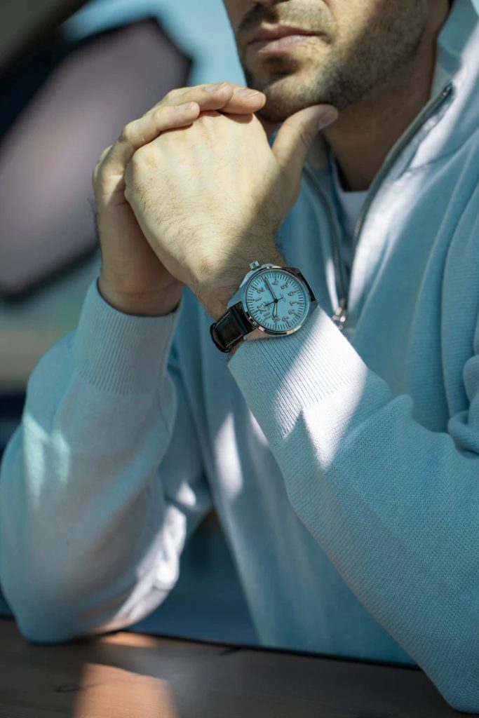 Ciferník, ktorý evokuje ducha pilotnej kabíny, je navrhnutý s matnou zrnitou textúrou, ktorá dodáva hodinkám viac prístrojového dojmu. Jeho minimalistické, vysokokontrastné ručičky a číslice zaručujú vynikajúcu prehľadnosť a čitateľnosť, zatiaľ čo okienko kalendára na pozícii troch hodín umocňuje jeho jedinečný dizajn. Každý detail bol premyslený tak, aby sa v ňom snúbila autentickosť so vzhľadom inšpirovaným letectvom.