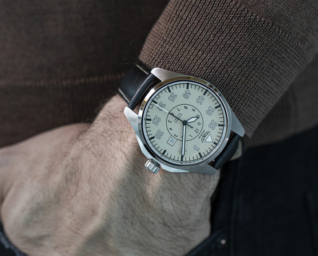 Ciferník, ktorý evokuje ducha pilotnej kabíny, je navrhnutý s matnou zrnitou textúrou, ktorá dodáva hodinkám viac prístrojový dojem. Jeho minimalistické, vysokokontrastné ručičky a číslice zaručujú vynikajúcu prehľadnosť a čitateľnosť, zatiaľ čo okienko kalendára na pozícii troch hodín umocňuje jeho jedinečný dizajn. Každý detail bol premyslený tak, aby sa v ňom snúbila autentickosť so vzhľadom inšpirovaným letectvom.