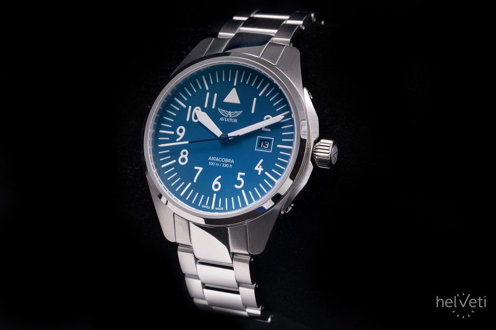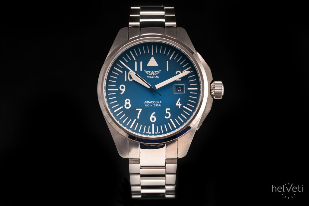 Hodinky Aviator Airacobra odrážajú robustný, klasický vzhľad s brúseným a dobre proporcionálnym puzdrom s priemerom 42,8 milimetra a svojím dizajnom vychádzajú priamo z histórie. Jeho nadrozmerná skrutkovacia korunka ponúka dobrý úchop, čo je výhodné najmä v kombinácii s autentickými pilotnými rukavicami zo 40. rokov minulého storočia.