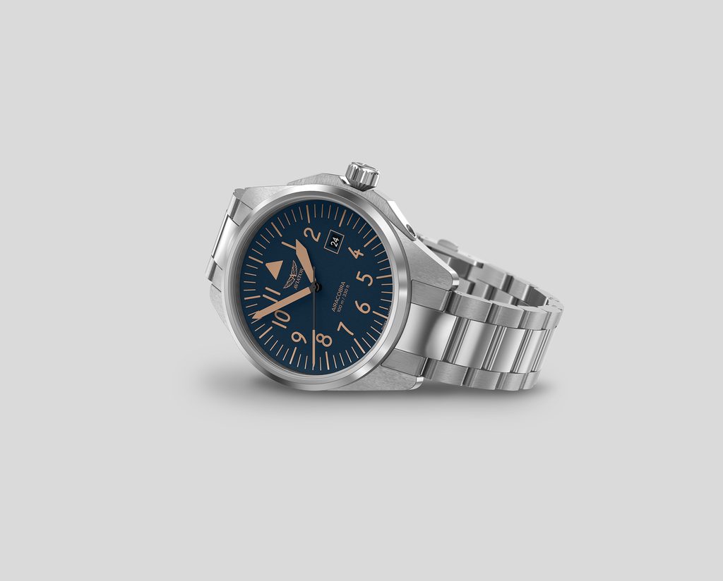 Ciferník, ktorý evokuje ducha pilotnej kabíny, je navrhnutý s matnou zrnitou textúrou, ktorá hodinkám dodáva viac prístrojového dojmu. Jeho minimalistické, vysokokontrastné ručičky a číslice zaručujú vynikajúcu prehľadnosť a čitateľnosť, zatiaľ čo okienko s dátumovkou na pozícii 3 hodín umocňuje jeho jedinečný dizajn. Každý detail bol premyslený tak, aby sa v ňom snúbila autenticita so vzhľadom inšpirovaným letectvom.