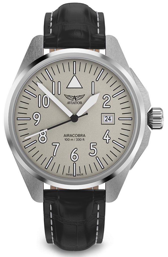 Hodinky Aviator Airacobra odrážajú robustný, klasický vzhľad s brúseným a dobre proporcionálnym puzdrom s priemerom 42,8 milimetra a svojím dizajnom vychádzajú priamo z histórie. Jeho nadrozmerná skrutkovacia korunka ponúka dobrý úchop, čo je výhodné najmä v kombinácii s autentickými pilotnými rukavicami zo 40. rokov minulého storočia. Srdcom hodiniek Aviator Airacobra 43 Type A V.1.38.0.320.4 je švajčiarsky strojček Ronda 6003.D poháňaný batériou.