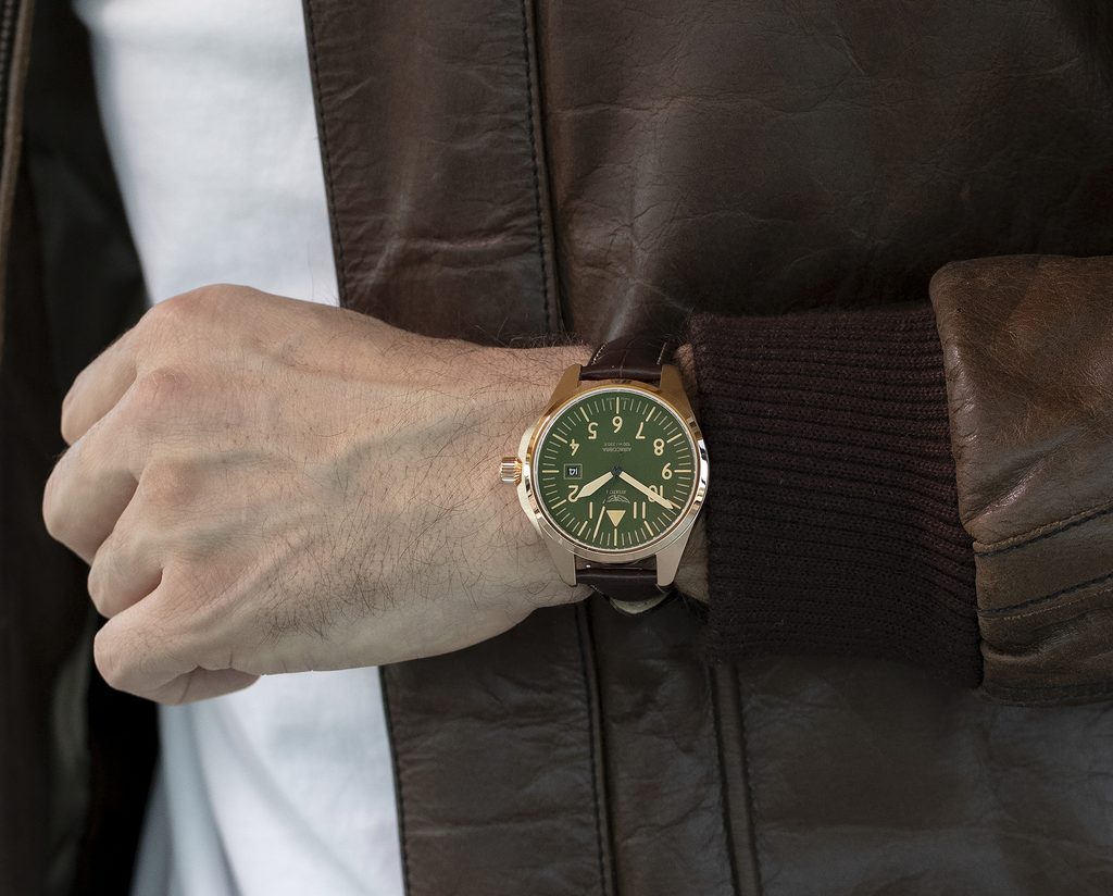 Ciferník, ktorý evokuje ducha pilotnej kabíny, je navrhnutý s matnou zrnitou textúrou, ktorá dodáva hodinkám prístrojovejší dojem. Jeho minimalistické, vysokokontrastné ručičky a číslice zaručujú vynikajúcu prehľadnosť a čitateľnosť, zatiaľ čo okienko s dátumovkou na pozícii 3 hodín umocňuje jeho jedinečný dizajn. Každý detail bol premyslený tak, aby sa v ňom snúbila autenticita so vzhľadom inšpirovaným letectvom.