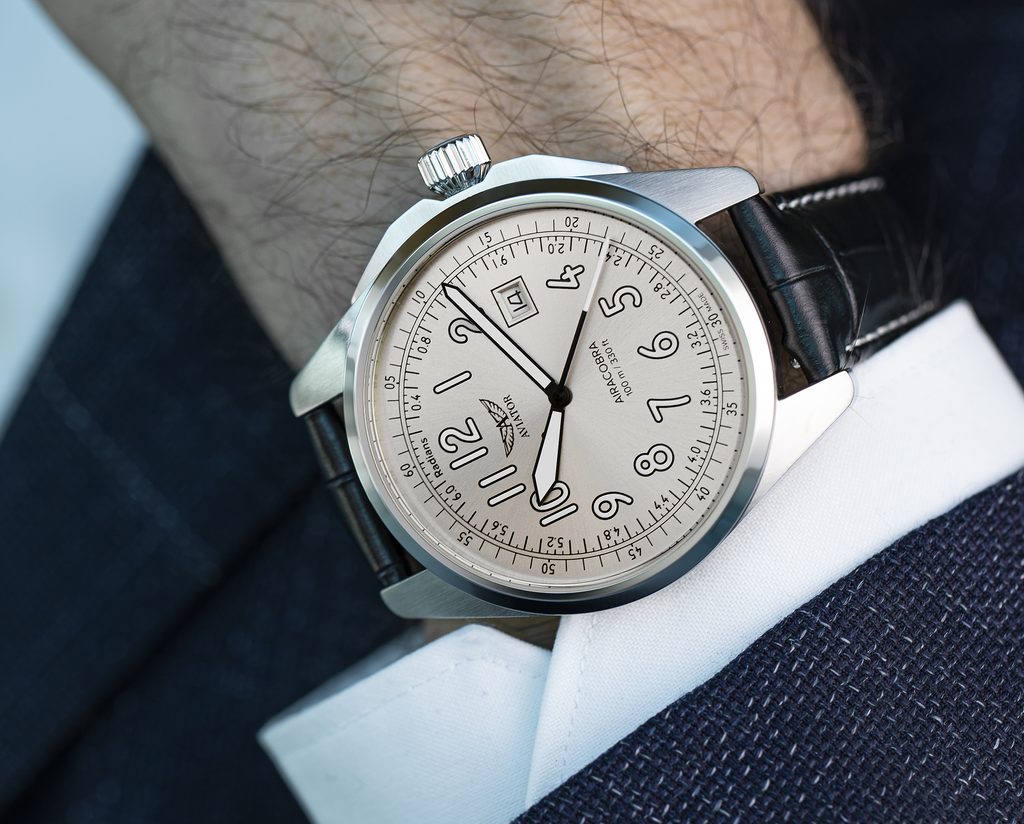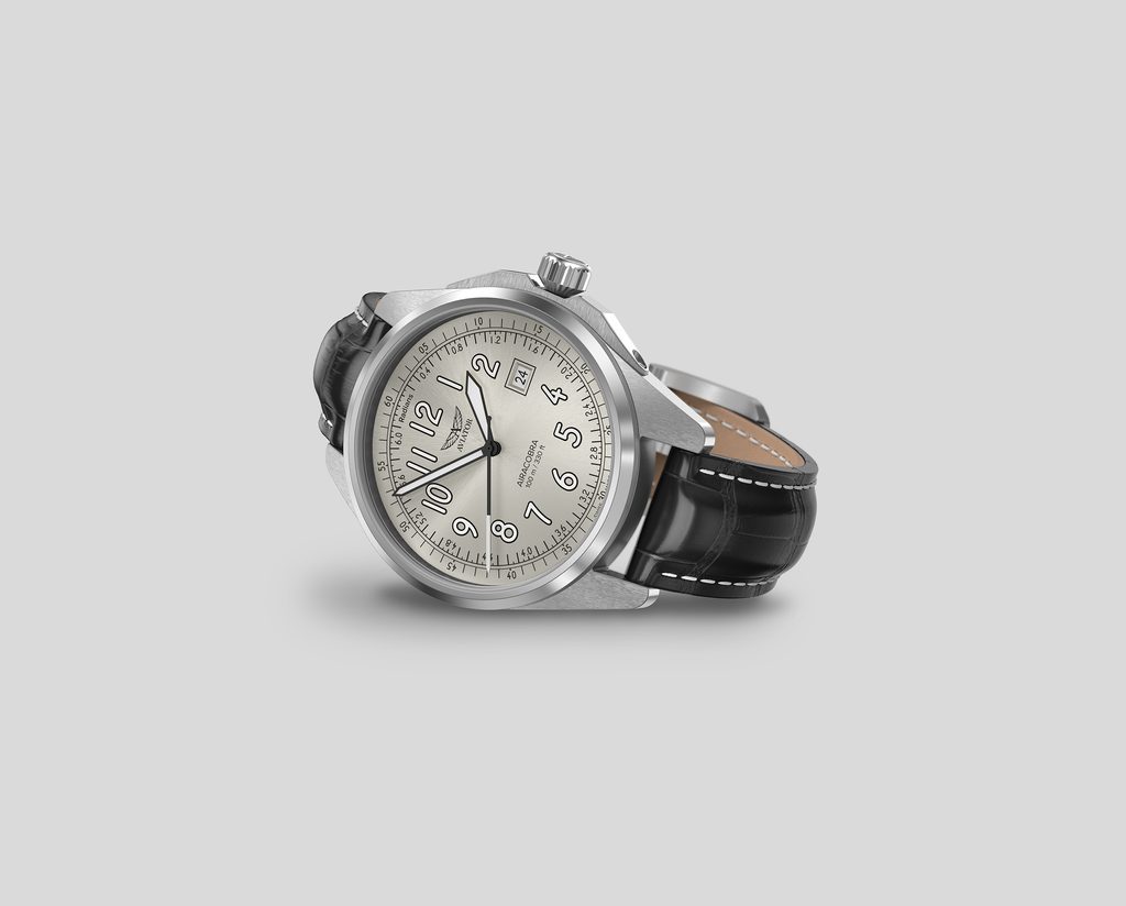 Ciferník, ktorý evokuje ducha pilotnej kabíny, je navrhnutý s matnou zrnitou textúrou, ktorá dodáva hodinkám prístrojovejší dojem. Jeho minimalistické, vysokokontrastné ručičky a číslice zaručujú vynikajúcu prehľadnosť a čitateľnosť, zatiaľ čo okienko s dátumovkou na pozícii 3 hodín umocňuje jeho jedinečný dizajn. Každý detail bol premyslený tak, aby sa v ňom snúbila autenticita so vzhľadom inšpirovaným letectvom.