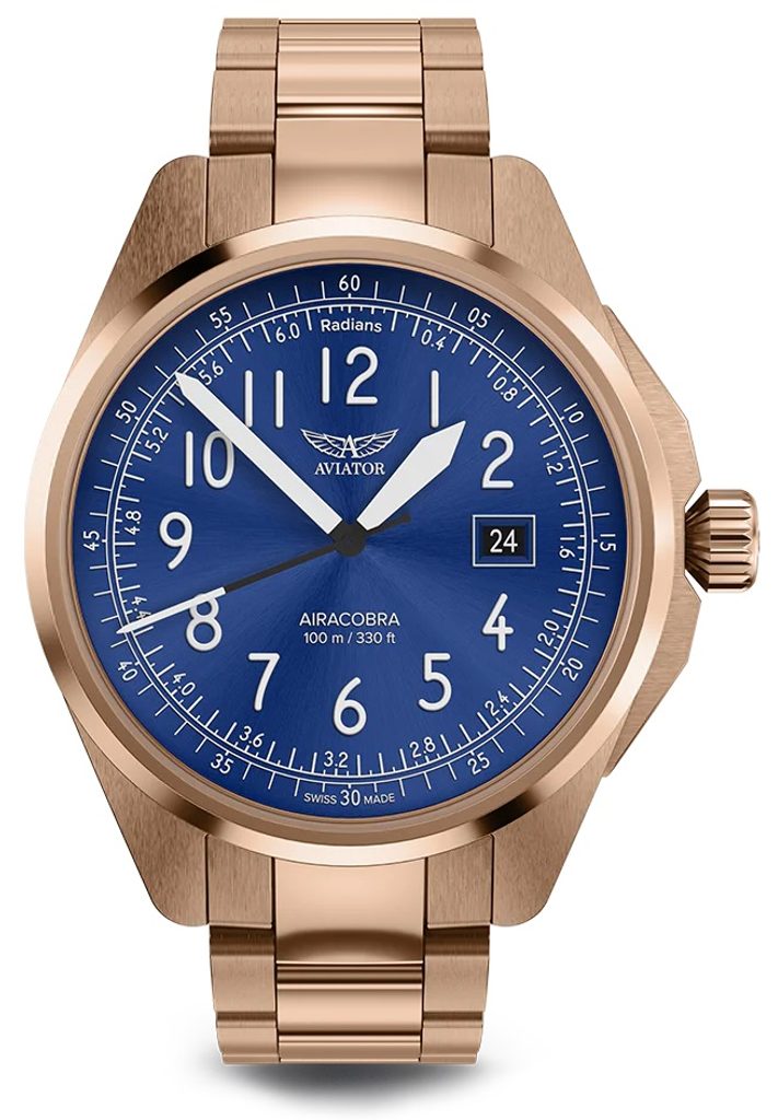 Hodinky Aviator Airacobra odrážajú robustný, klasický vzhľad s brúseným a dobre proporcionálnym puzdrom s priemerom 42,8 milimetra a svojím dizajnom vychádzajú priamo z histórie. Jeho nadrozmerná skrutkovacia korunka ponúka dobrý úchop, čo je výhodné najmä v kombinácii s autentickými pilotnými rukavicami zo 40. rokov minulého storočia. Srdcom hodiniek Aviator Airacobra 43 Type B V.1.38.2.325.5 je švajčiarsky strojček Ronda 6003.D poháňaný batériou.