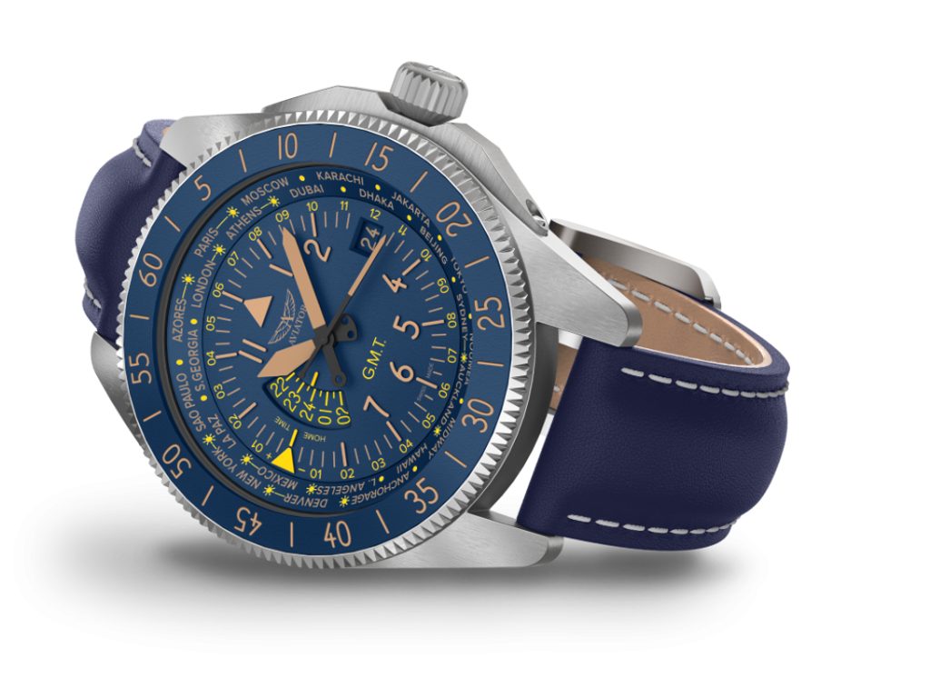 Hodinky Aviator Airacobra GMT, inšpirované touto inováciou, v sebe spájajú štýl a ergonómiu, pričom vo svojich lunetách odrážajú tvar lietadla a krídla a zároveň vzdávajú hold lietadlu Airacobra. Ciferník inšpirovaný prístrojmi lietadla zdôrazňuje viditeľnosť a čitateľnosť všetkých možných údajov.