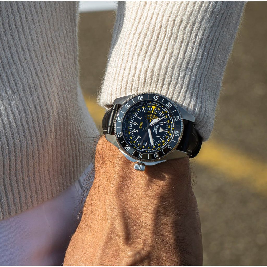 Hodinky Aviator Airacobra GMT, inšpirované touto inováciou, v sebe spájajú štýl a ergonómiu, pričom vo svojich lunetách odrážajú tvar lietadla a krídla a zároveň vzdávajú hold lietadlu Airacobra. Ciferník inšpirovaný prístrojmi lietadla zdôrazňuje viditeľnosť a čitateľnosť všetkých možných údajov.