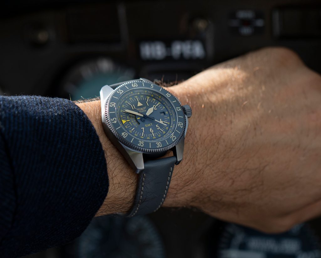 Hodinky Aviator Airacobra GMT, inšpirované touto inováciou, v sebe spájajú štýl a ergonómiu, pričom vo svojich lunetách odrážajú tvar lietadla a krídla a zároveň vzdávajú hold lietadlu Airacobra. Ciferník inšpirovaný prístrojmi lietadla zdôrazňuje viditeľnosť a čitateľnosť všetkých možných údajov.
