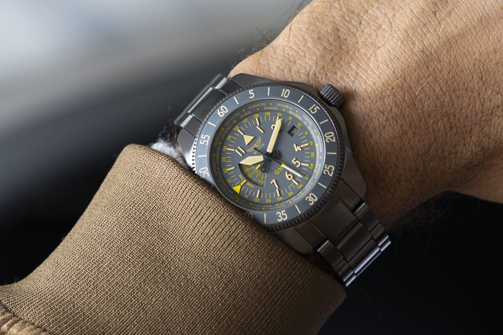 S priemerom puzdra 42,8 mm sa hodinky Aviator Airacobra GMT V.1.37.7.305.5 hodia na väčšinu pánskych zápästí. Vodotesnosť 10 ATM naznačuje, že tieto hodinky sú skvelým spoločníkom nielen vo vzduchu, ale aj počas plávania vo vode.