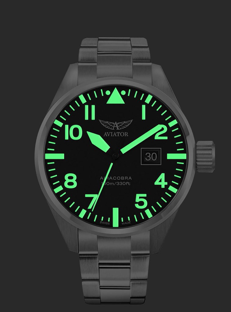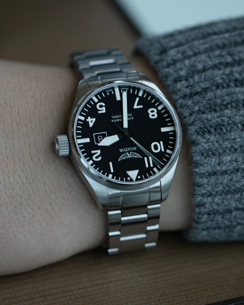 Hodinky Aviator Airacobra, ktoré odrážajú robustný, klasický vzhľad s brúseným a dobre proporcionálnym 42-milimetrovým puzdrom, majú dizajn priamo z histórie. Jeho nadrozmerná skrutkovacia korunka ponúka dobrý úchop, čo je obzvlášť výhodné v kombinácii s autentickými pilotnými rukavicami zo 40. rokov.