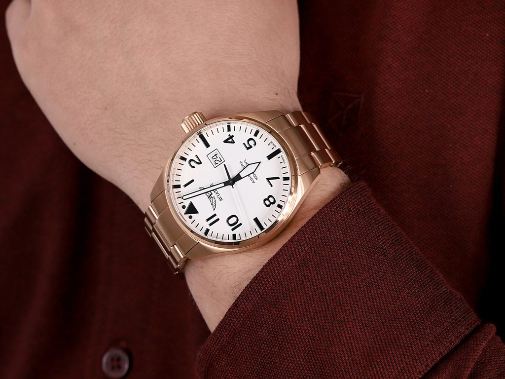 Hodinky Aviator Airacobra, ktoré odrážajú robustný, klasický vzhľad s brúseným a dobre proporcionálnym 42 milimetrovým oceľovým puzdrom so zlatou PVD úpravou, sú dizajnovo ako vystrihnuté z histórie. Jeho nadrozmerná skrutkovacia korunka ponúka dobrý úchop, čo je obzvlášť výhodné v kombinácii s autentickými pilotnými rukavicami zo 40. rokov.