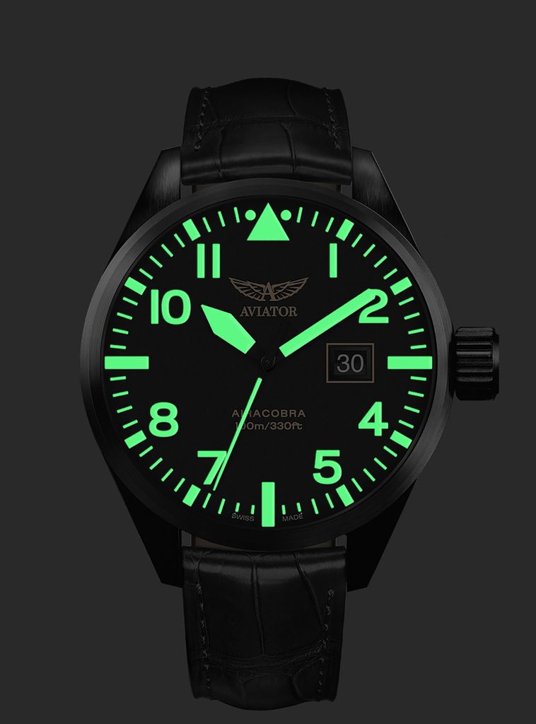 Hodinky Aviator Airacobra, ktoré odrážajú robustný, klasický vzhľad s brúseným a dobre proporcionálnym 42 milimetrovým oceľovým puzdrom s čiernou PVD úpravou, sú dizajnovo ako vystrihnuté z histórie. Jeho nadrozmerná skrutkovacia korunka ponúka dobrý úchop, čo je obzvlášť výhodné v kombinácii s autentickými pilotnými rukavicami zo 40. rokov.
