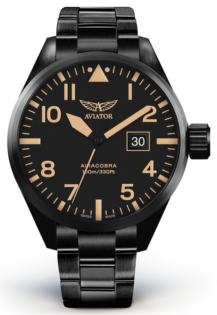 Hodinky Aviator Airacobra, ktoré odrážajú robustný, klasický vzhľad s brúseným a dobre proporcionálnym 42 milimetrovým oceľovým puzdrom s čiernou PVD úpravou, sú dizajnovo ako vystrihnuté z histórie. Jeho nadrozmerná skrutkovacia korunka ponúka dobrý úchop, čo je obzvlášť výhodné v kombinácii s autentickými pilotnými rukavicami zo 40. rokov.
