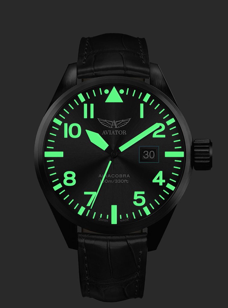 Hodinky Aviator Airacobra, ktoré odrážajú robustný, klasický vzhľad s brúseným a dobre proporcionálnym 42 milimetrovým oceľovým puzdrom s čiernou PVD úpravou, sú dizajnovo ako vystrihnuté z histórie. Jeho nadrozmerná skrutkovacia korunka ponúka dobrý úchop, čo je obzvlášť výhodné v kombinácii s autentickými pilotnými rukavicami zo 40. rokov.