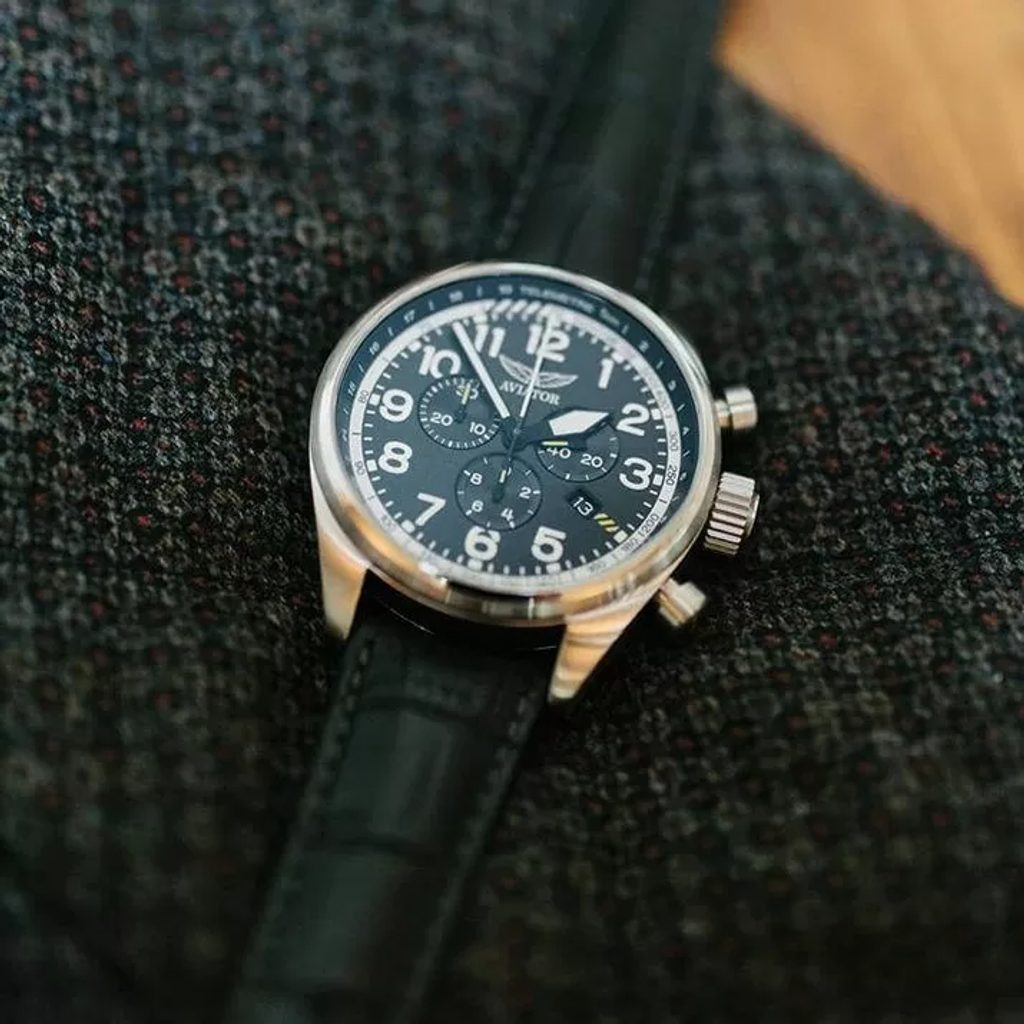Hodinky Aviator Airacobra, ktoré odrážajú robustný, klasický vzhľad s brúseným a dobre proporcionálnym 45-milimetrovým puzdrom, svojím dizajnom vychádzajú priamo z histórie. Jeho nadrozmerná skrutkovacia korunka ponúka dobrý úchop, čo je výhodné najmä v kombinácii s autentickými pilotnými rukavicami zo 40. rokov. Srdcom hodiniek je spoľahlivý švajčiarsky batériový strojček Ronda 5040 D, ktorý je vybavený praktickými funkciami, ako sú stopky, ukazovateľ dátumu, tachymeter a telemeter.