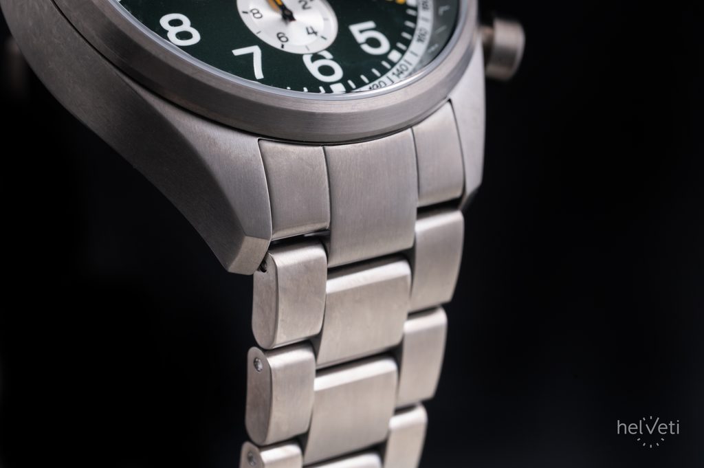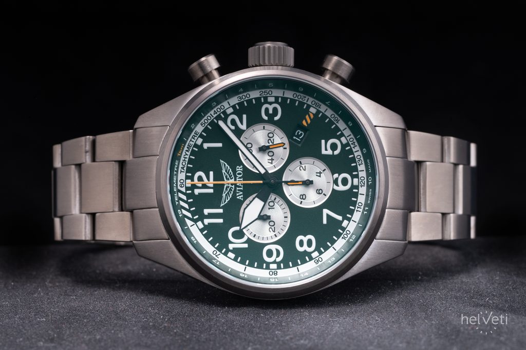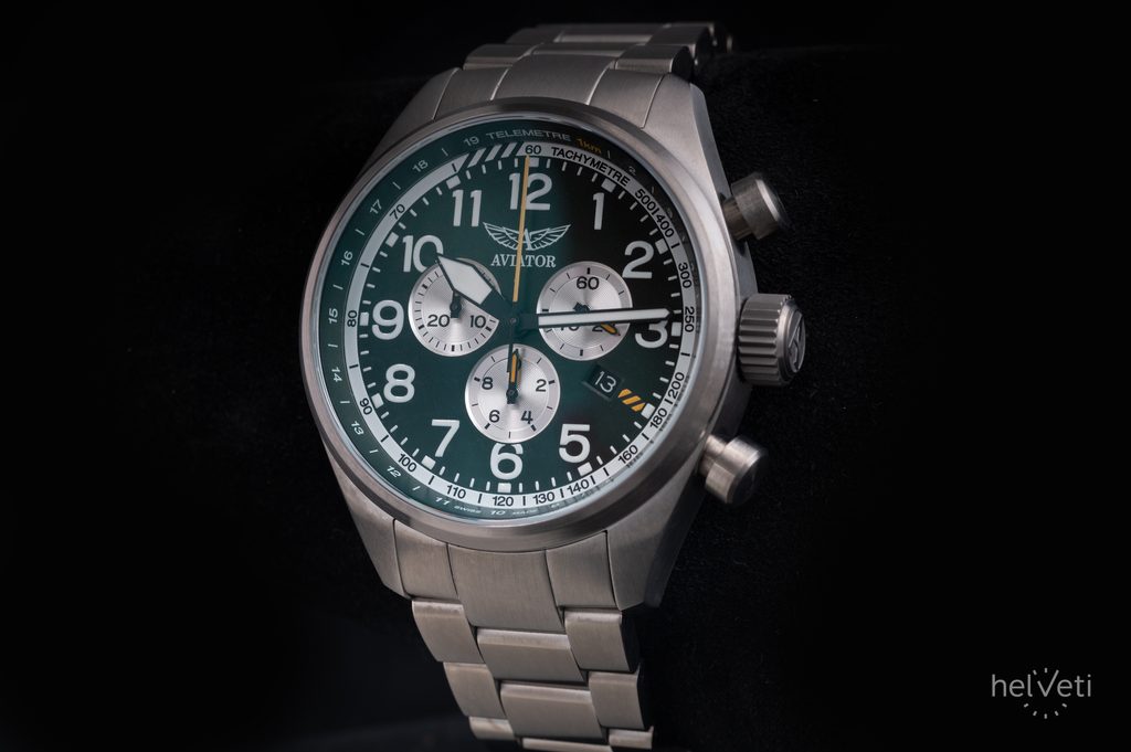 Hodinky Aviator Airacobra odrážajú robustný, klasický vzhľad s rezaným a dobre proporcionálnym 45-milimetrovým puzdrom a ich dizajn vychádza priamo z histórie. Jeho nadrozmerná skrutkovacia korunka ponúka dobrý úchop, čo je obzvlášť výhodné v kombinácii s autentickými pilotnými rukavicami zo 40. rokov. Srdcom hodiniek je spoľahlivý švajčiarsky batériový strojček Ronda 5040 D, ktorý je vybavený praktickými funkciami, ako sú stopky, ukazovateľ dátumu, tachymeter a telemeter.