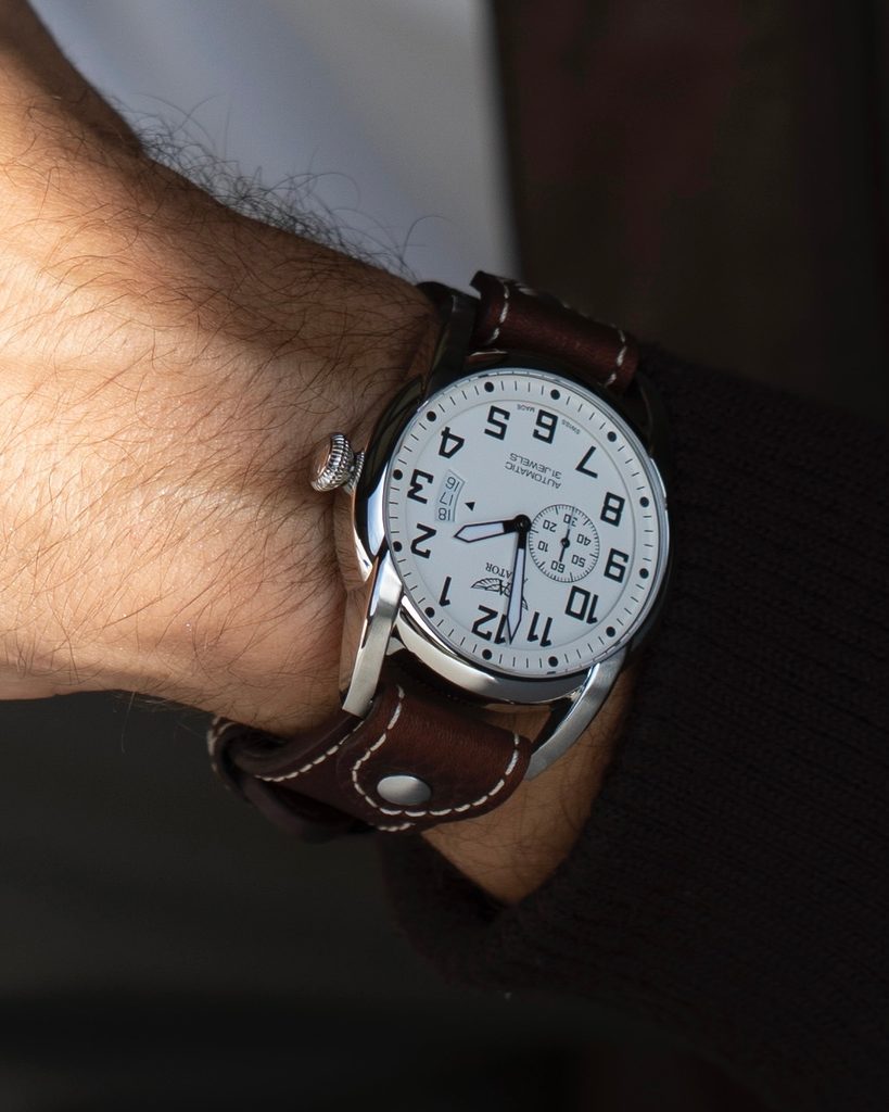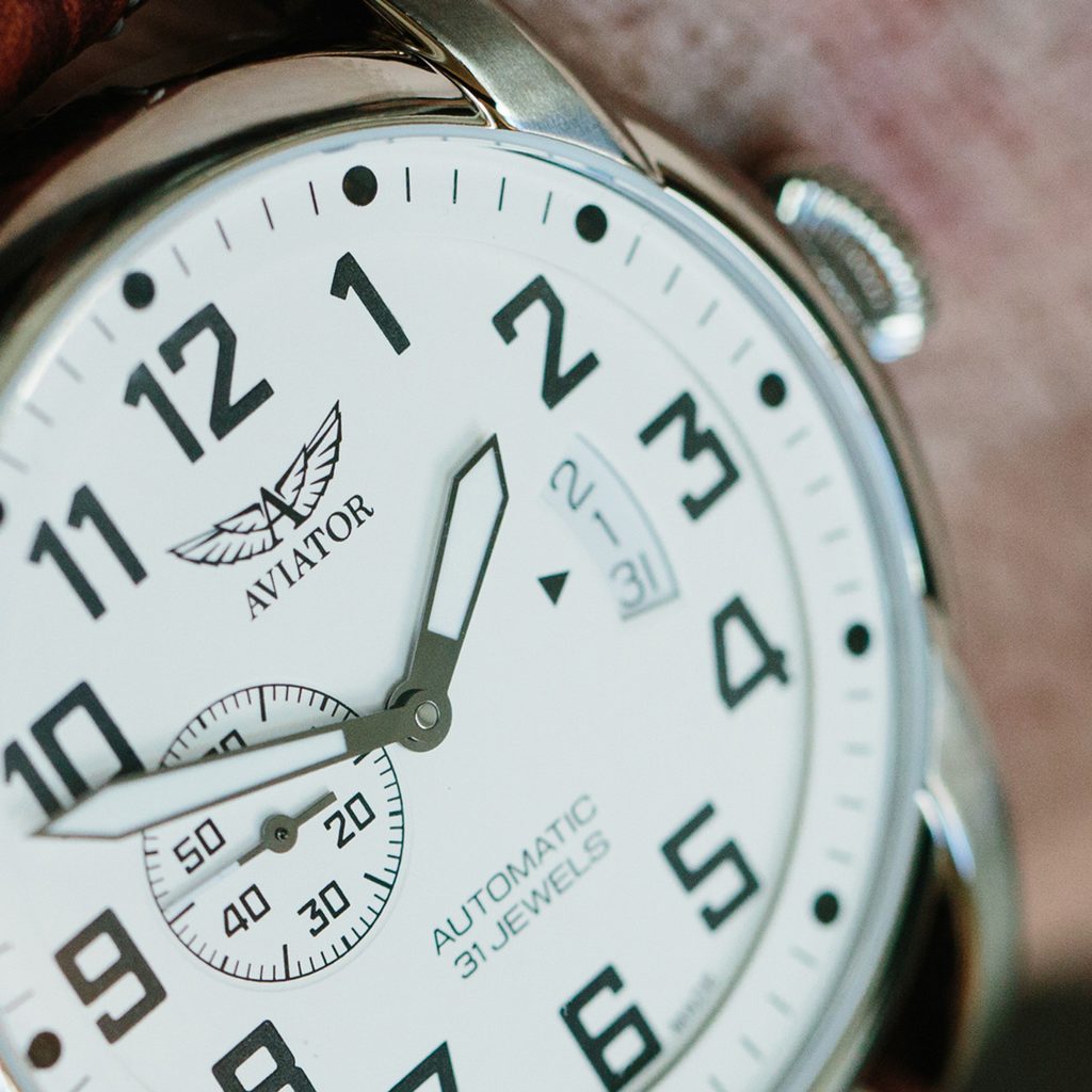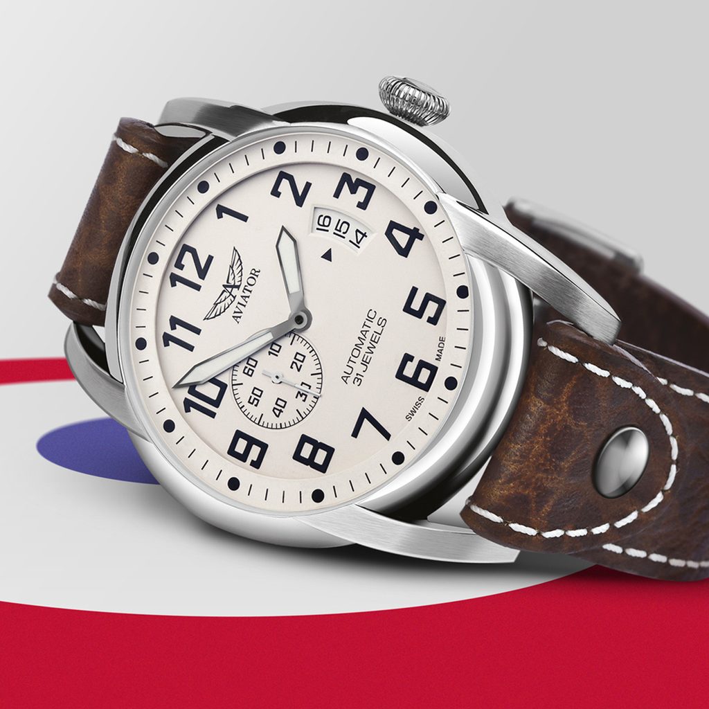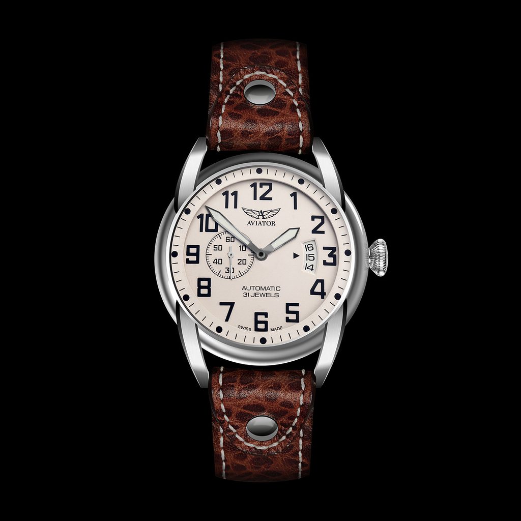 Stačí jeden pohľad a je jasné, že tieto hodinky vás prenesú do prvých dní letectva. Hodinky Aviator Bristol Scout Automatic využívajúce dizajn prvých hodín v kokpite, výrazné číslice a okrúhle indexy majú nielen jedinečný vzhľad, ale sú aj mimoriadne čitateľné. Malá sekundová ručička umiestnená na 9. hodine pomáha pilotom zaistiť presný chod hodiniek, pričom sekundy bežia nepretržite. Vintage štýl elegantne dopĺňa okienko s dátumovkou v štýle výškomeru na 3. hodine.