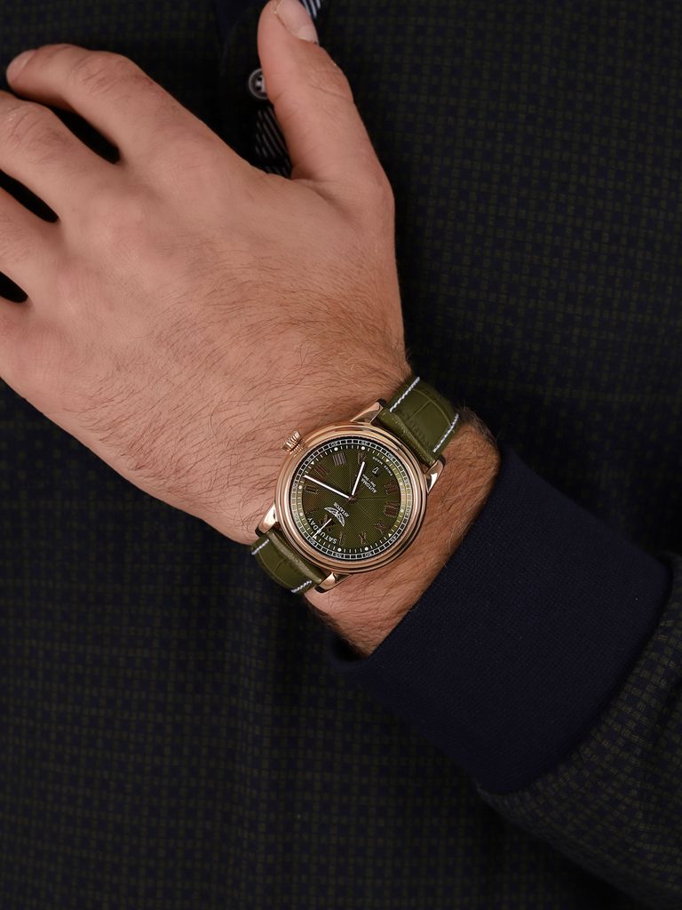 Puzdro hodiniek je vyrobené z nehrdzavejúcej ocele so zlatou PVD úpravou. Jeho zaoblené krivky sú ručne opracované jemnými hodinárskymi technikami a sú inšpirované ladnou sofistikovanosťou trupu lietadla Douglas. Jeho úžasné zrkadlovo leštené plochy sú zefektívnené ergonomicky uhladenými líniami. Keďže každé puzdro Aviator je výsledkom vysoko precíznej konštrukcie a ergonómie, získate dobre navrhnuté proporcie a rozmery puzdra v harmónii so všetkými ostatnými prvkami hodiniek.