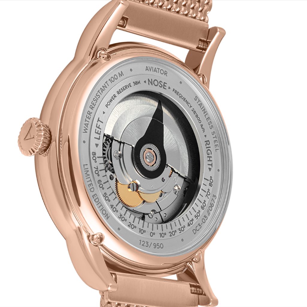 Puzdro hodiniek Aviator Douglas DC-3 Automatic V.3.32.2.237.5 je vyrobené z nehrdzavejúcej ocele so zlatou PVD úpravou. Je ručne opracované jemnými hodinárskymi technikami a jeho zaoblené krivky sú inšpirované elegantnou prepracovanosťou trupu lietadla Douglas. Jeho úžasné, zrkadlovo leštené povrchy sú umocnené ergonomicky plynulými líniami.