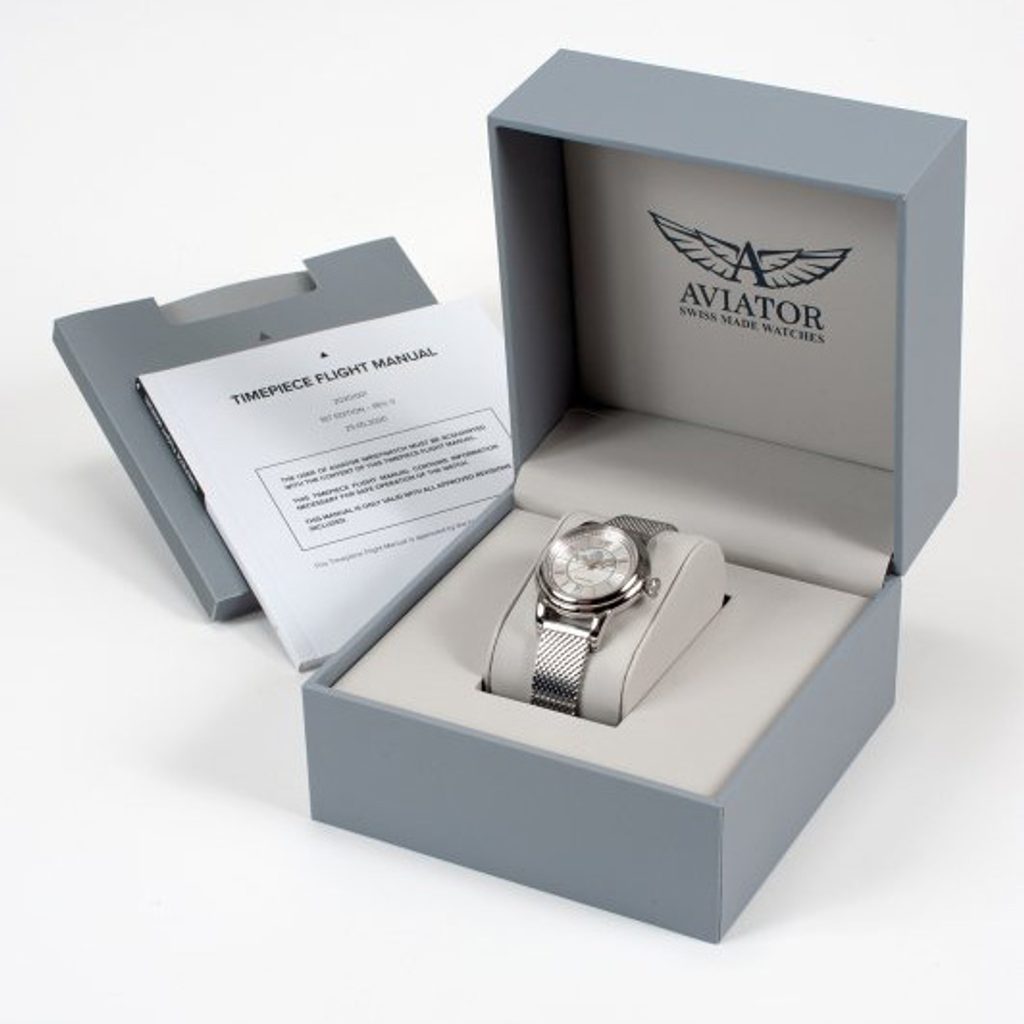 Hodinky Aviator Douglas Moonflight V.1.33.0.250.5 s priemerom puzdra 36 mm sú vhodné na väčšinu dámskych zápästí. Vodotesnosť 10 ATM naznačuje, že hodinky budú skvelým spoločníkom nielen vo vzduchu, ale aj pri plávaní vo vode.