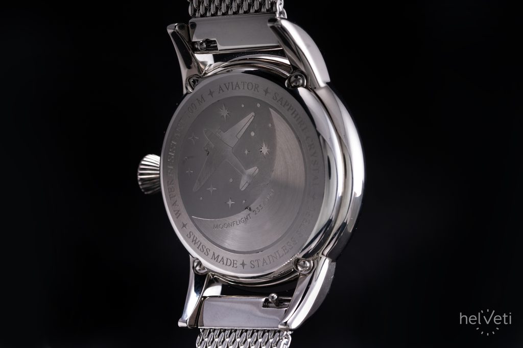 Zlatý vek letectva priniesol do cestovania novú úroveň sofistikovanosti. Módni návrhári vniesli extravaganciu a umenie do dizajnu oceľových uniforiem lietadiel a palubného personálu. Nočné lety na palube lietadla Douglas DC-3 ponúkali luxusné vybavenie a veľkolepú mystiku mesiaca za oknami - od západu do východu slnka. Inšpirovaný touto érou luxusu a tajomným pôvabom mesiaca prináša Aviator MoonFlight eleganciu na dosah ruky. Farebná paleta, lesklé hladké povrchy a slnečné giloše sú skutočne veľmi podobné 30. rokom minulého storočia. Obláčiky z čistej perlete evokujú krásnu jednoduchosť s nádychom flapper módy, zatiaľ čo fascinujúci disk s fázami mesiaca zachytáva nočnú oblohu tak, ako žiarila pred mnohými mesiacmi a bude svietiť aj naďalej.