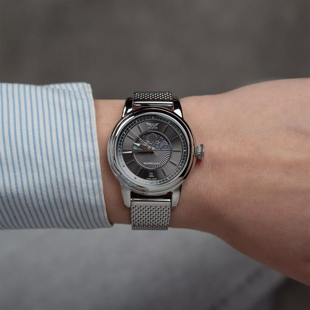 O vplyve Mesiaca na našu Zem a všetok život na nej už nikto nepochybuje. Ovplyvňuje náš spánok a naše myslenie alebo vzostup a pokles oceánov a morí. Počas 8 fáz, ktorými Mesiac prechádza každých 29,5 dňa, sa intenzita jeho sily mení. Dámske hodinky Aviator Moonflightsú navrhnuté tak, aby ste tieto fázy mohli kedykoľvek sledovať pohľadom na hodinky.