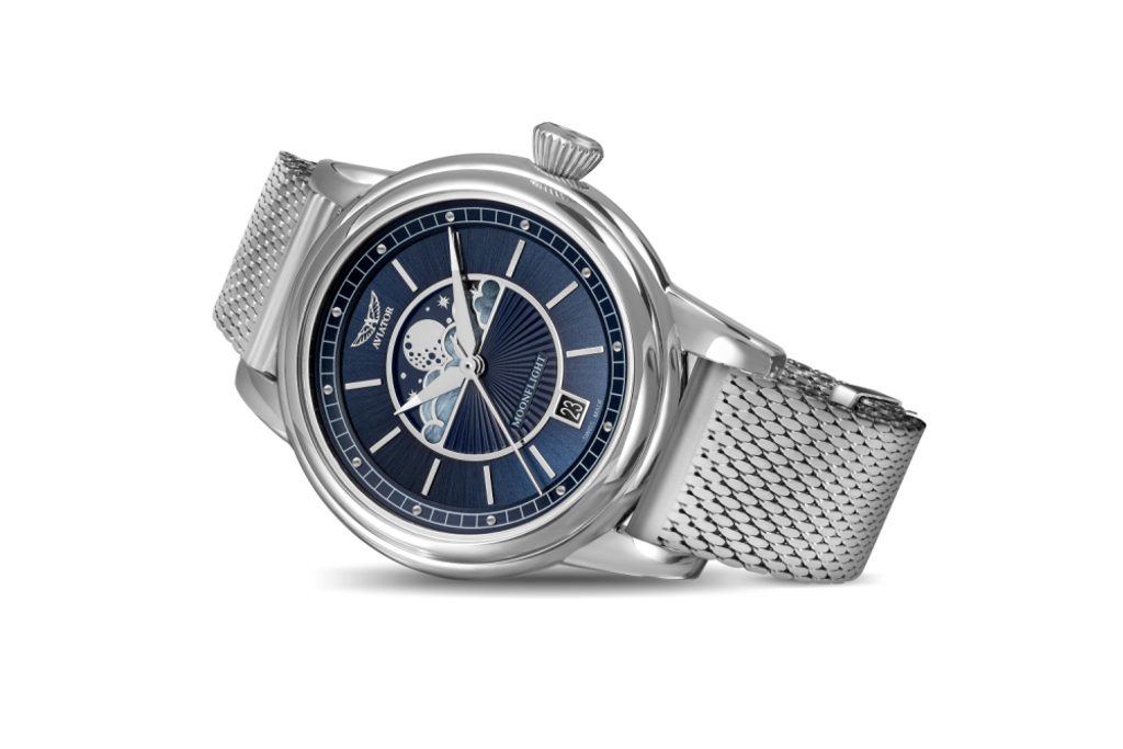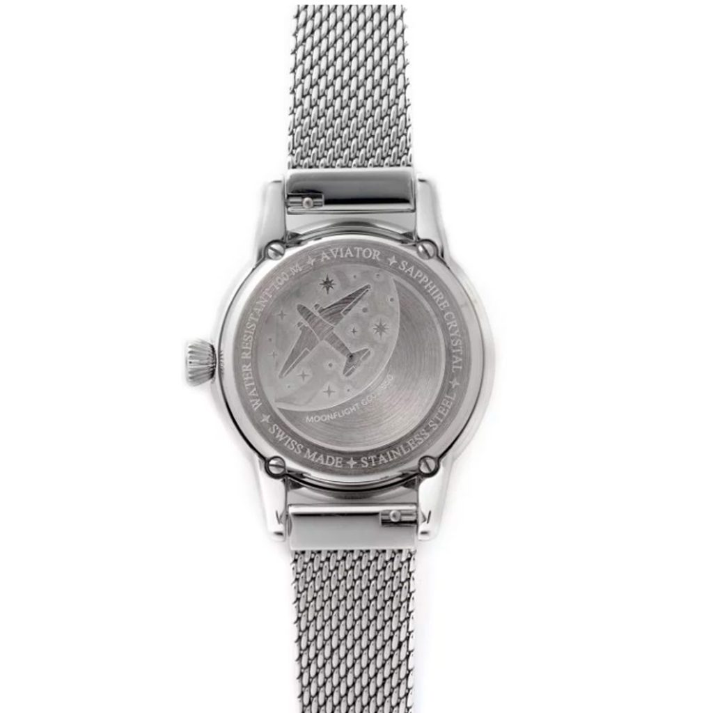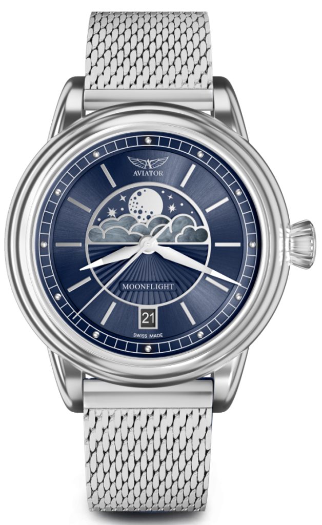 Zlatý vek letectva priniesol do cestovania novú úroveň sofistikovanosti. Módni návrhári vniesli extravaganciu a umenie do dizajnu oceľových uniforiem lietadiel a palubného personálu. Nočné lety na palube lietadla Douglas DC-3 ponúkali luxusné vybavenie a veľkolepú mystiku mesiaca za oknami - od západu do východu slnka. Inšpirovaný touto érou luxusu a tajomným pôvabom mesiaca prináša Aviator MoonFlight eleganciu na dosah ruky. Farebná paleta, lesklé hladké povrchy a slnečné giloše sú skutočne veľmi podobné 30. rokom minulého storočia. Obláčiky z čistej perlete evokujú krásnu jednoduchosť s nádychom flapper módy, zatiaľ čo fascinujúci disk s fázami mesiaca zachytáva nočnú oblohu tak, ako žiarila pred mnohými mesiacmi a bude svietiť aj naďalej.