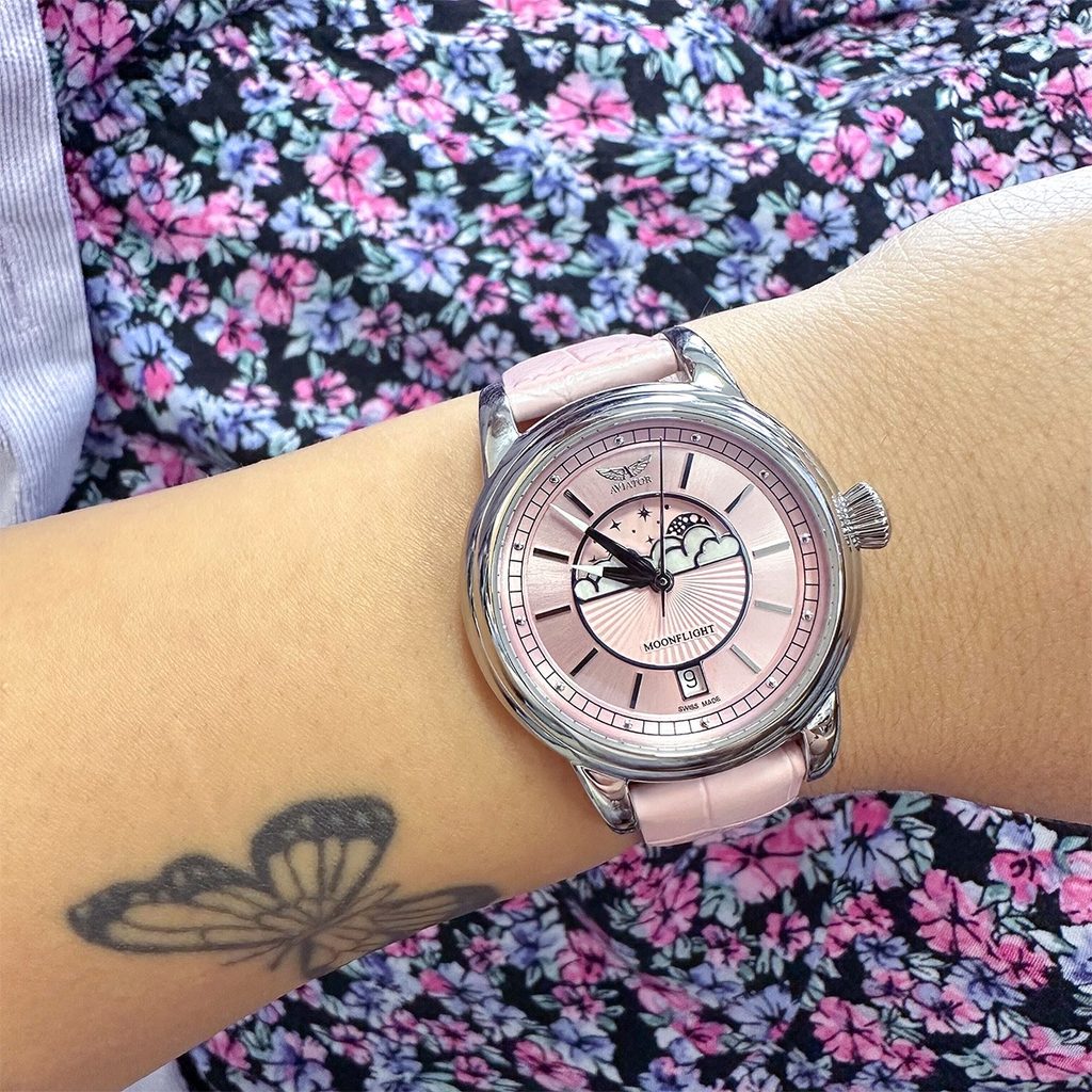 O vplyve Mesiaca na našu Zem a všetok život na nej už nikto nepochybuje. Ovplyvňuje náš spánok a naše myslenie či vzostup a pokles oceánov a morí. Počas 8 fáz, ktorými Mesiac prechádza každých 29,5 dňa, sa intenzita jeho sily mení. Dámske hodinky Aviator Moonflightsú navrhnuté tak, aby ste tieto fázy mohli kedykoľvek sledovať pohľadom na hodinky.